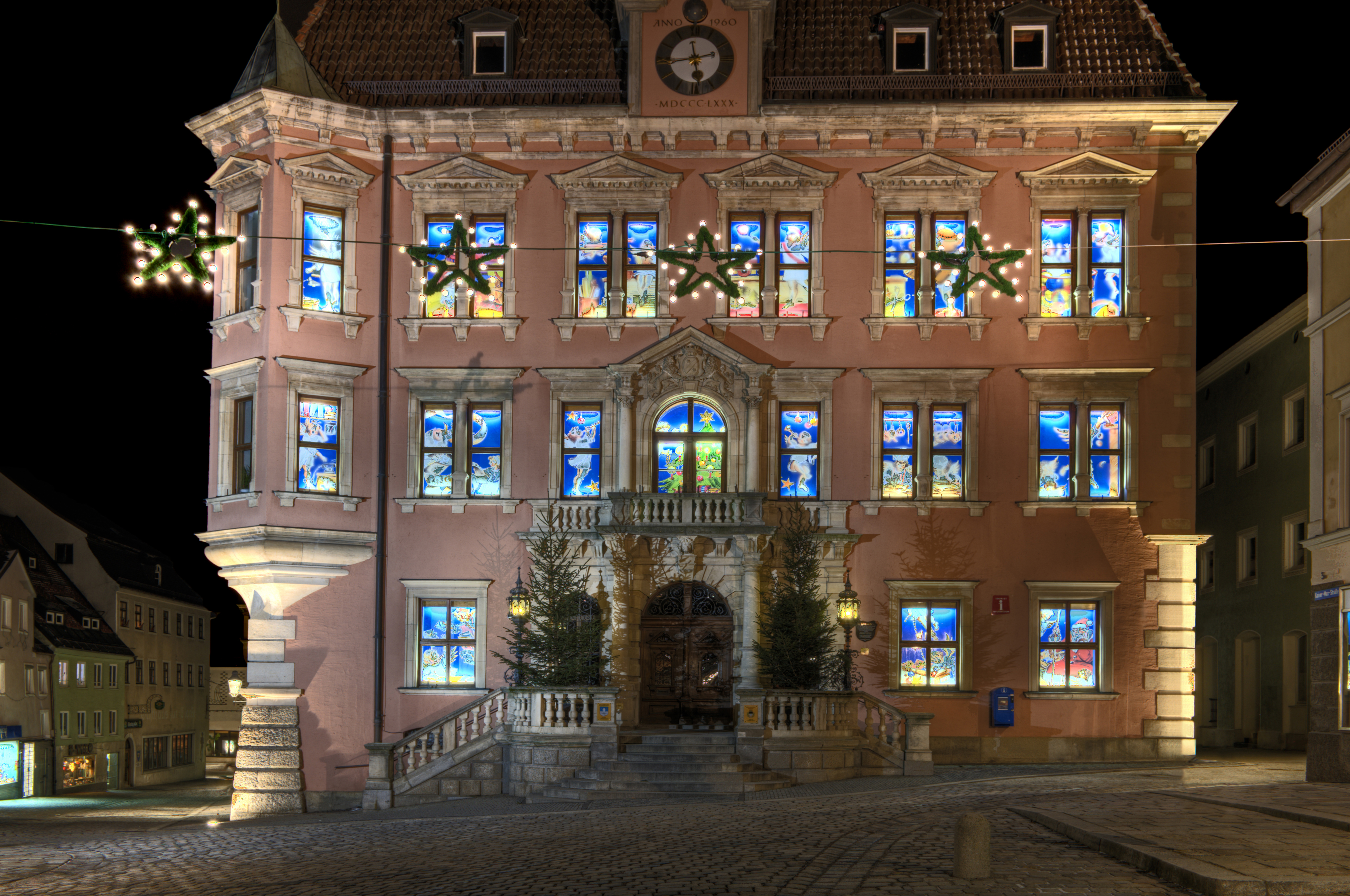 Das historische Kaufbeurer Rathaus als Adventskalender zur Weihnachtszeit.