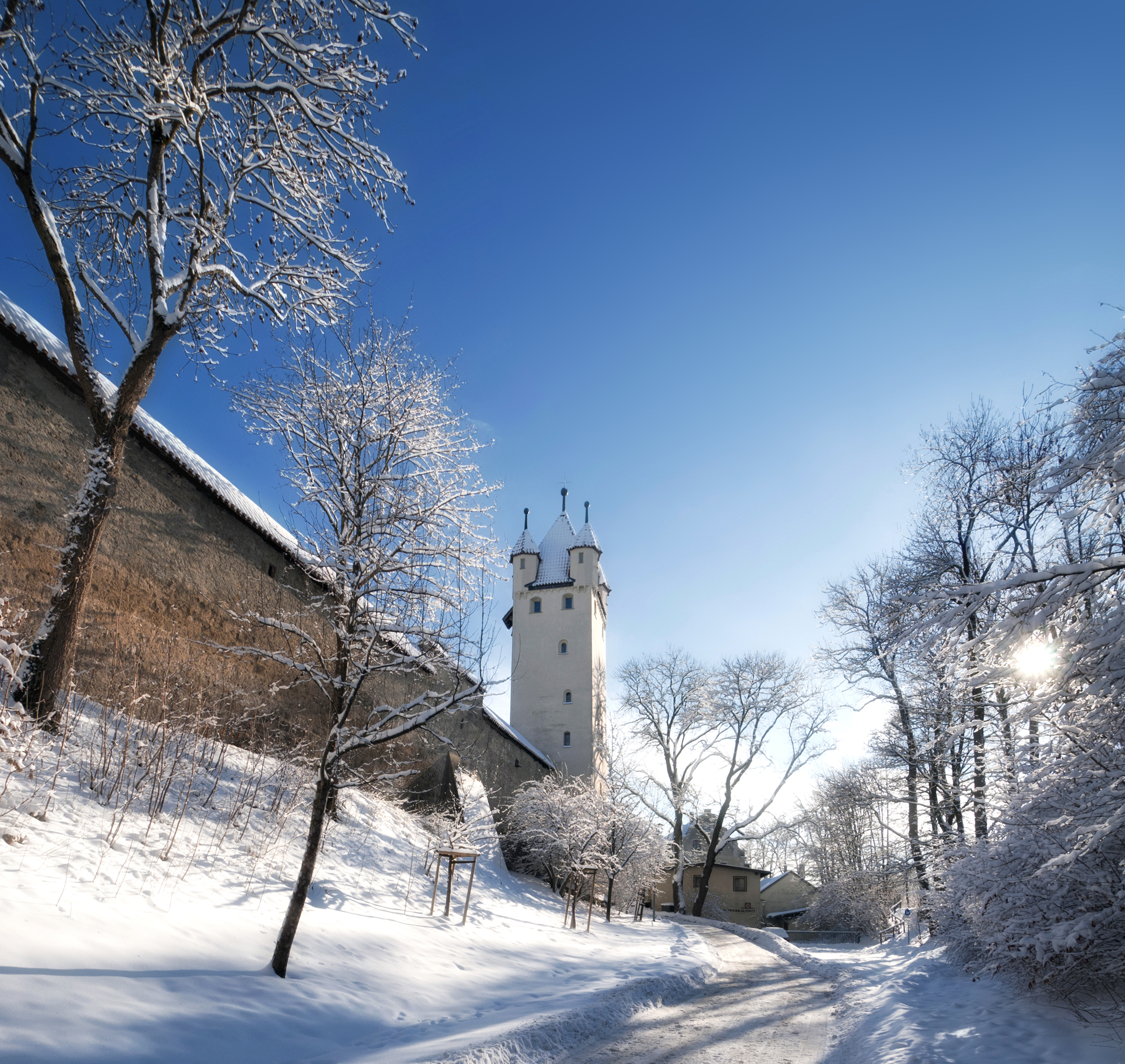 Blick auf die Stadtmauer und den Fünfknopfturm im Winter.
