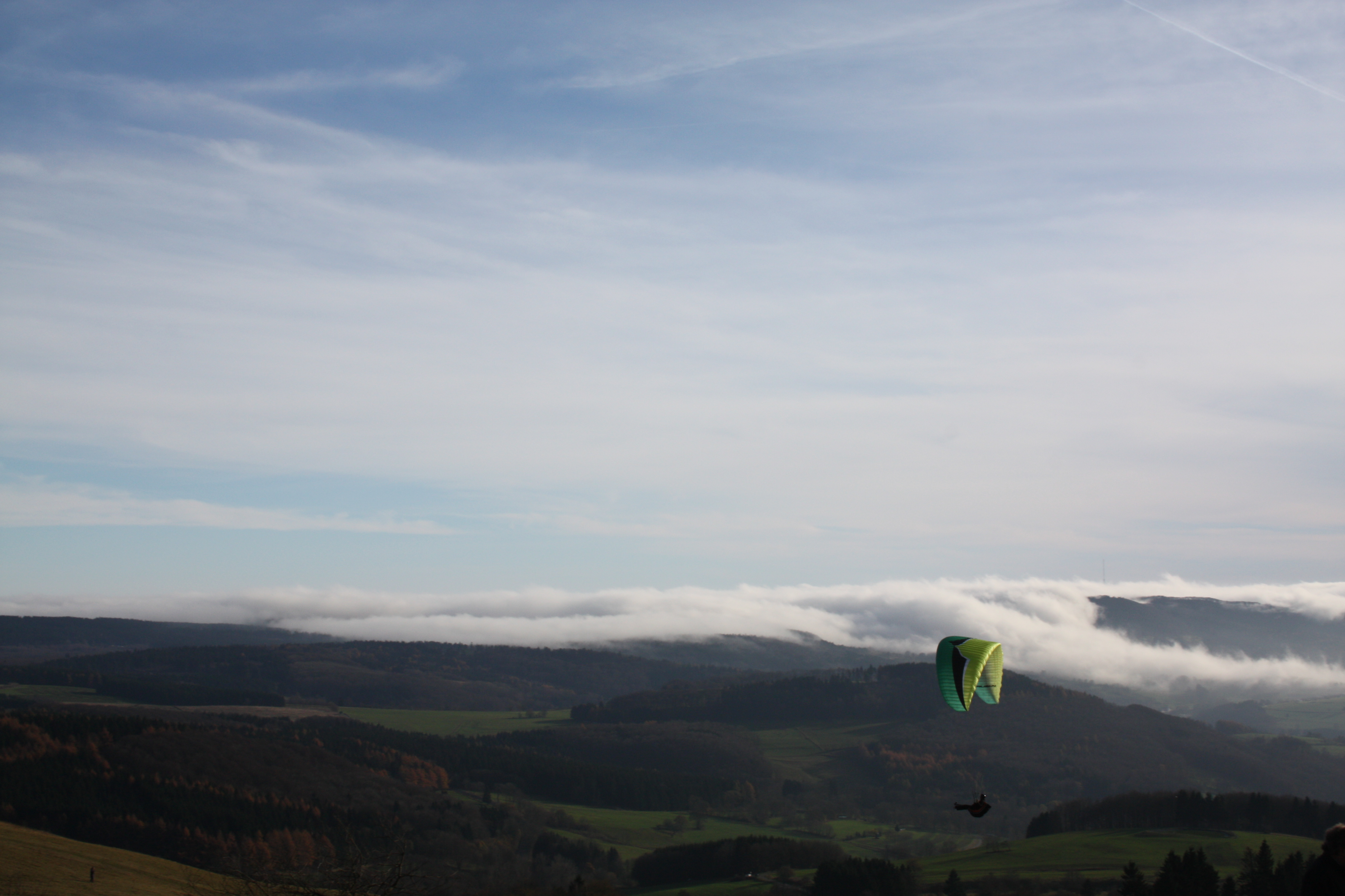 Paraglider mit dem Ausblick von der Wasserkuppe in das Biosphärenreservat Rhön.
