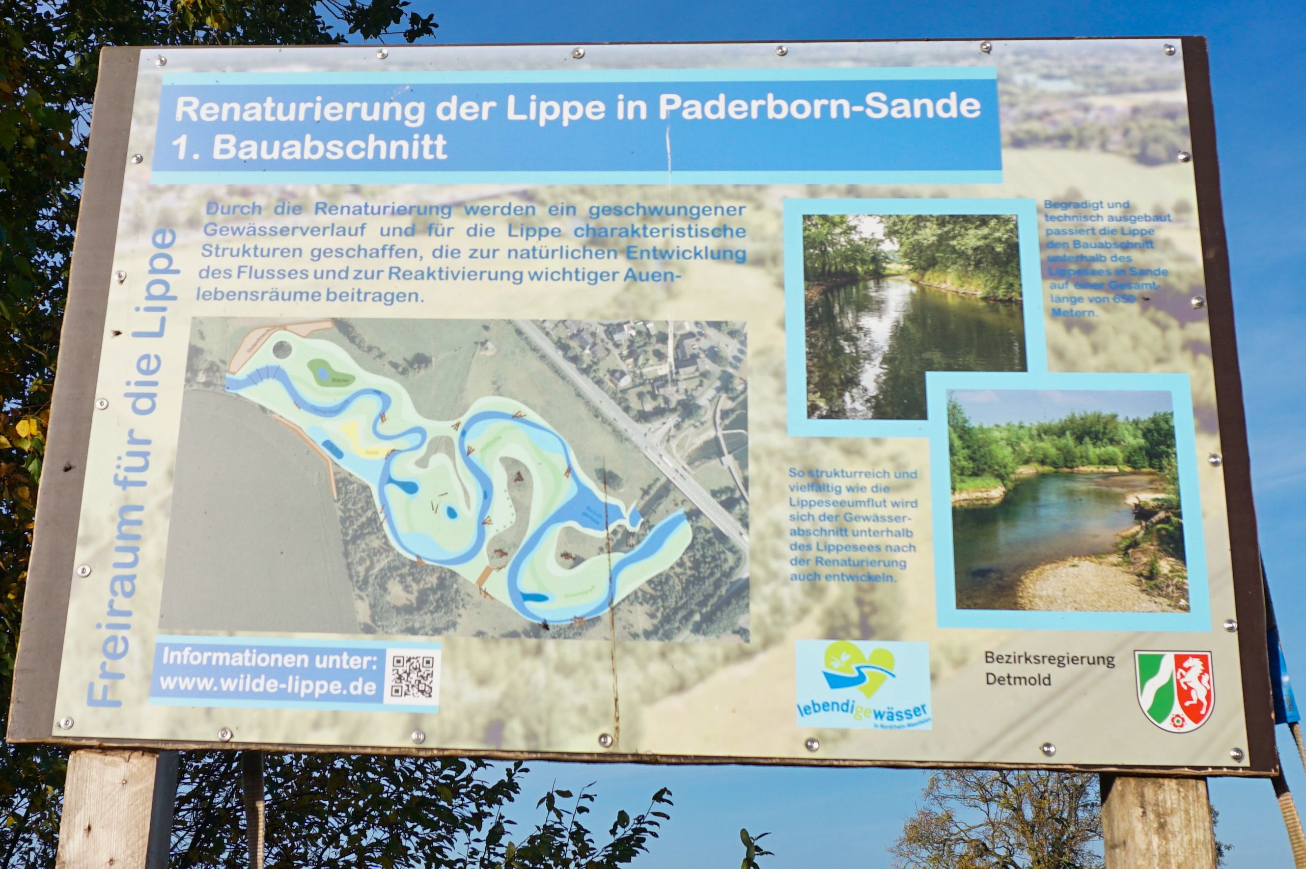 Infotafel Renaturierungsarbeiten Herbst 2021 am Ufer der Lippe bei Sande, Paderborn.