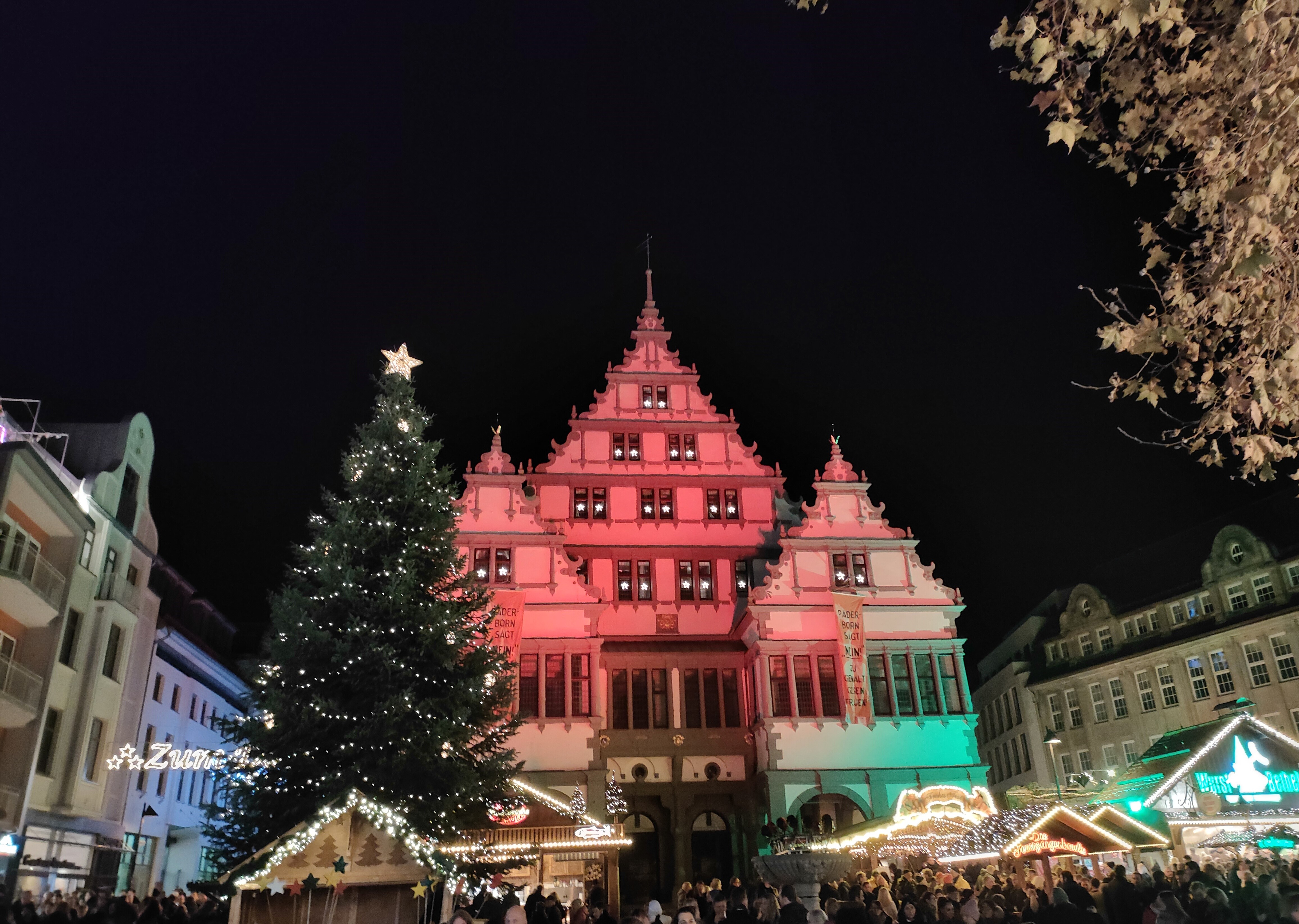Das illuminierte Rathaus von Paderborn zu Weihnachten.