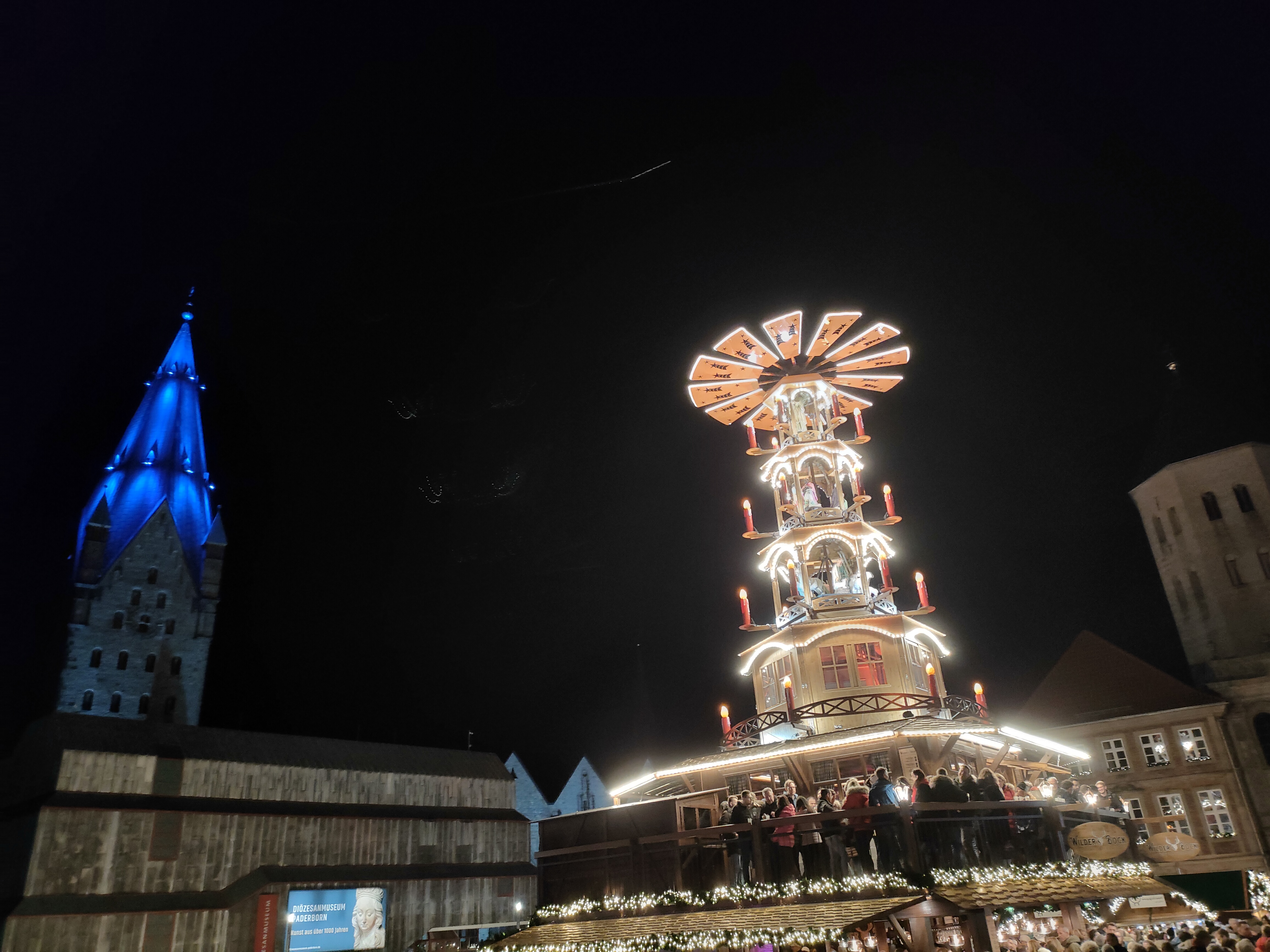 Der Paderborner Weihnachtsmarkt am Dom mit der illuminierten Weihnachtspyramide.