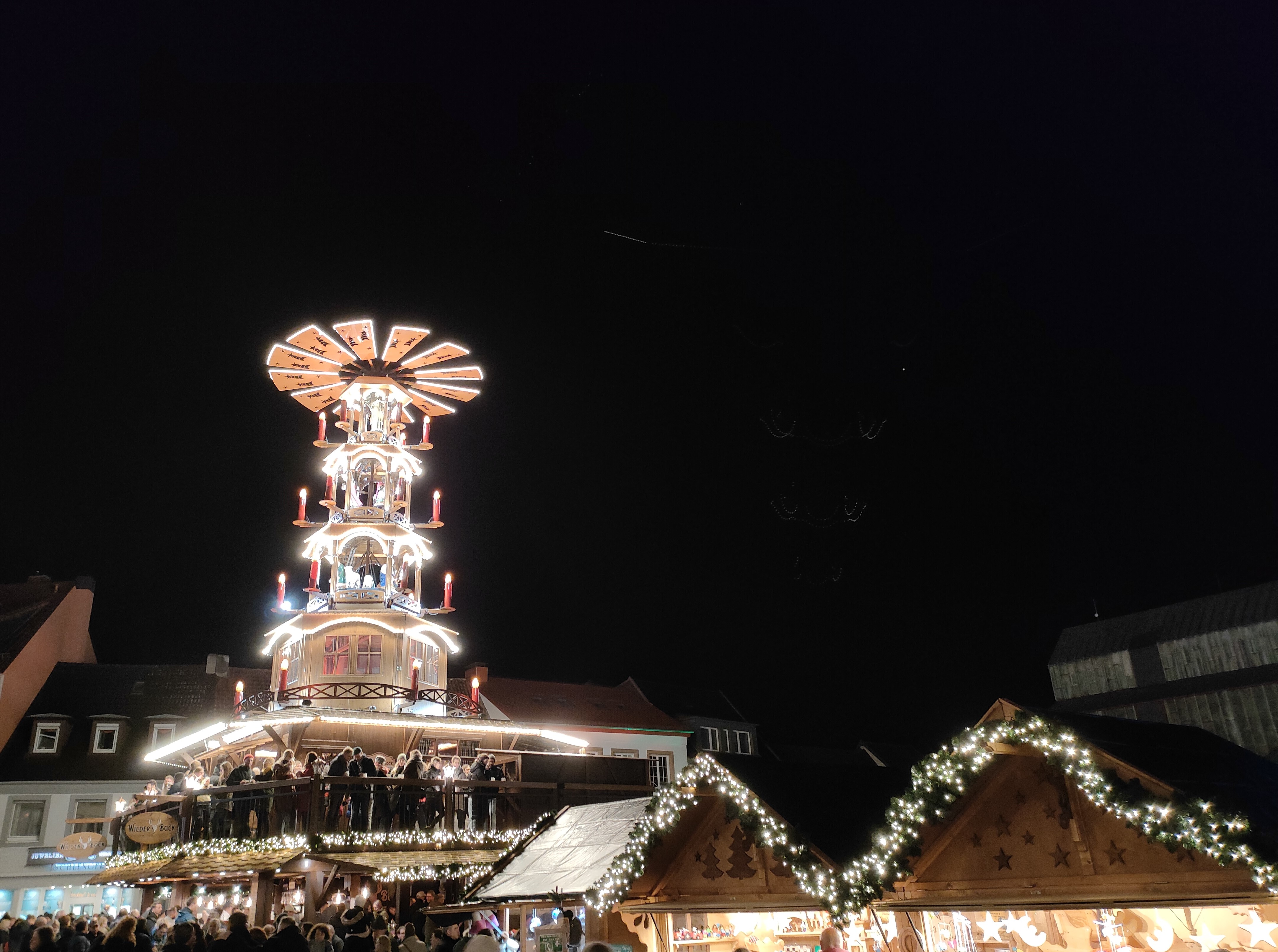 Der Paderborner Weihnachtsmarkt am Dom mit der illuminierten Weihnachtspyramide.