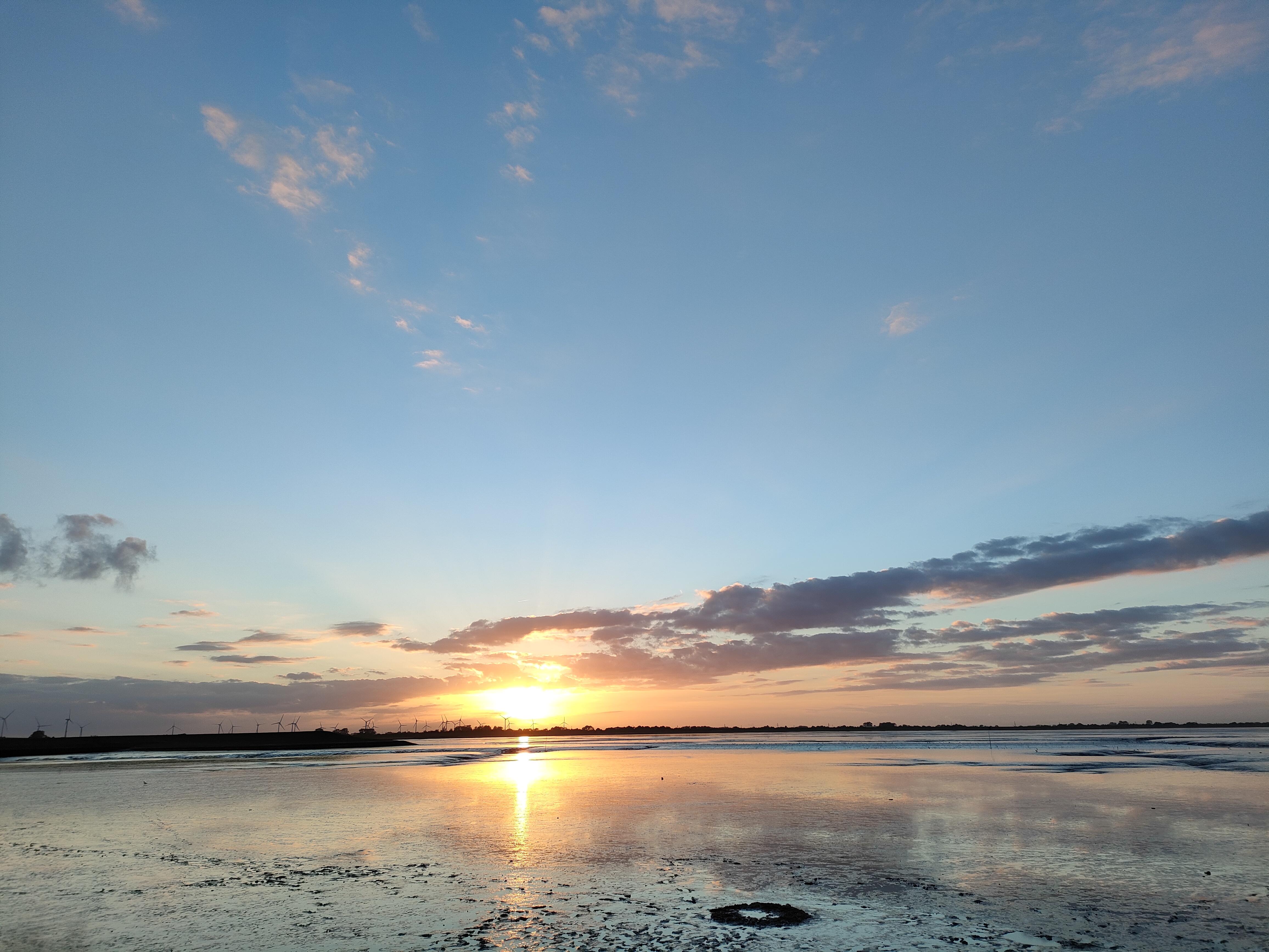 Ebbe mit Watt und Sonnenuntergang am Strand von Dangast, Varel.
