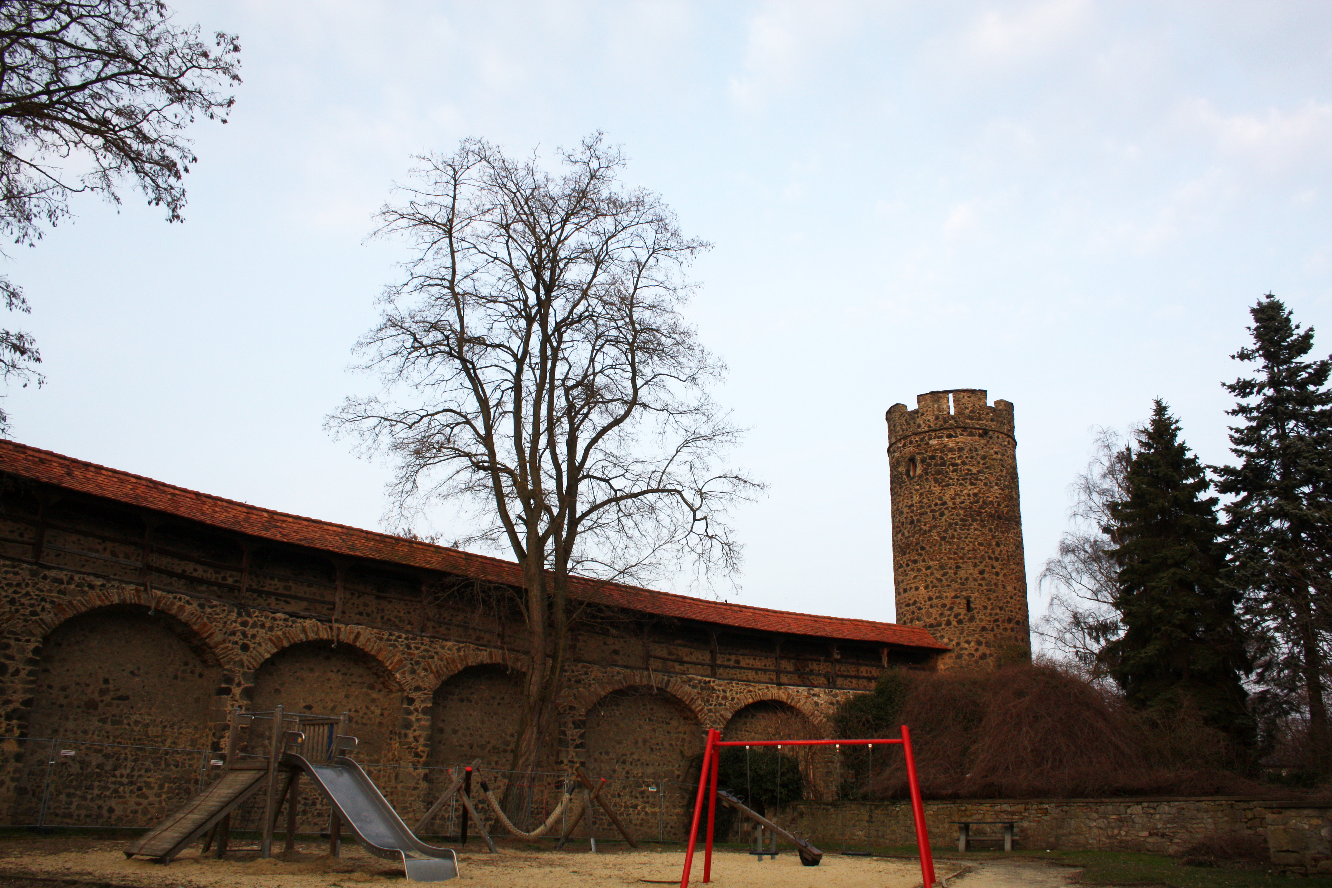 Der Butzbacher Hexenturm mit Schwibbögen und Kinderspielplatz.