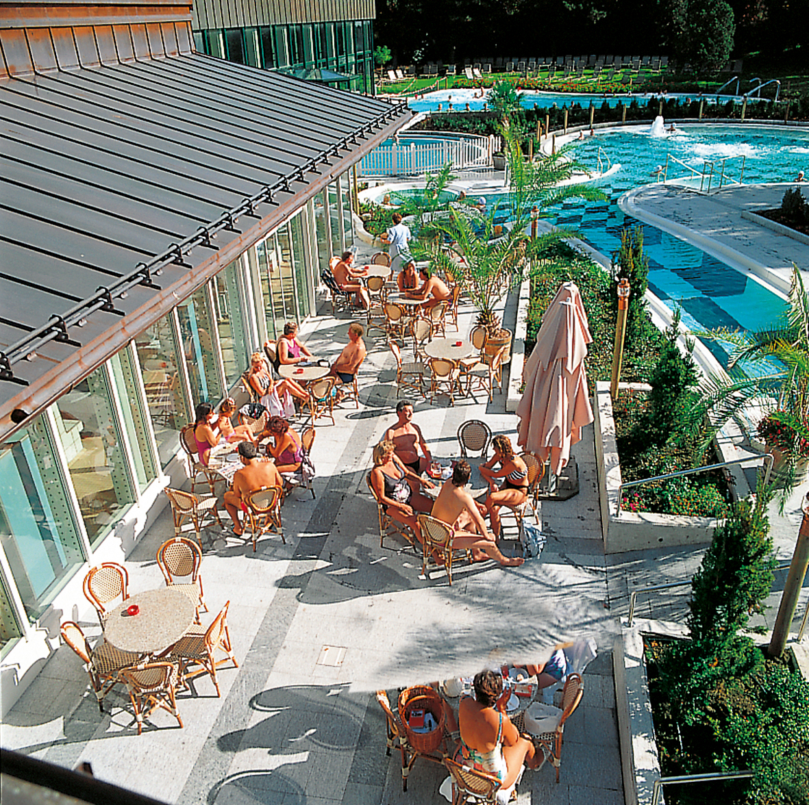 Außenbereich vom Restaurant Bel'Mare des Alpamare Bad Tölz.