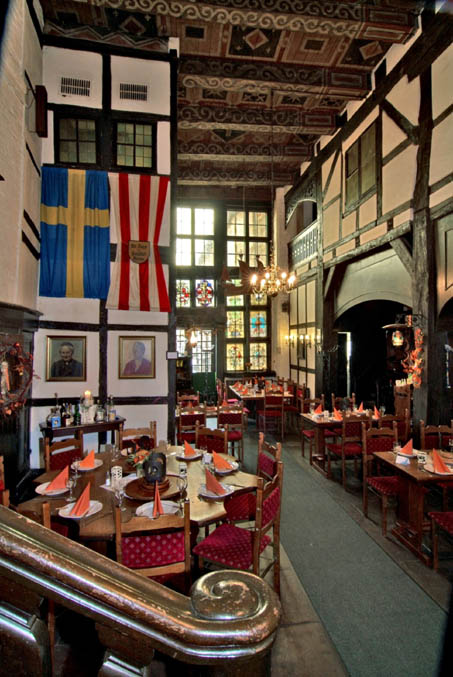 Diele im Haus Weinberg mit seiner bemalten Balkendecke aus dem 17. Jahrhundert.