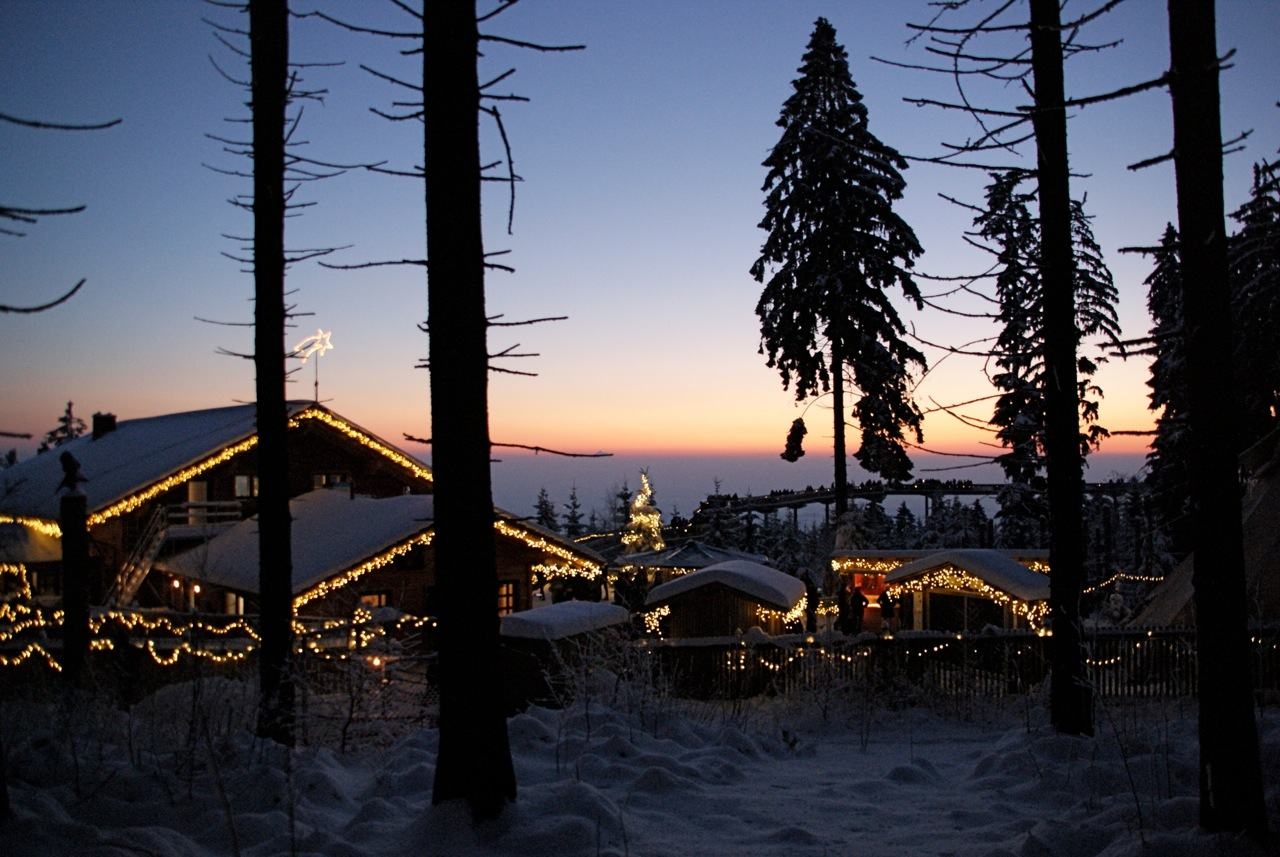 Stimmungsvoll leuchtet der Waldwipfelweg in Sankt Englmar im Bayerischen Wald an den Adventswochenenden. Groß wie Klein lassen Landschaft und Atmosphäre aus der luftigen Höhe des Erlebnispfads auf sich wirken. Zum Programm zählen Weihnachtsmusik, Märchenerzähler und Feuerkünstler, kulinarisch locken regionale Spezialitäten wie Sengzelten, Glühwein oder selbstgemachter Punsch.