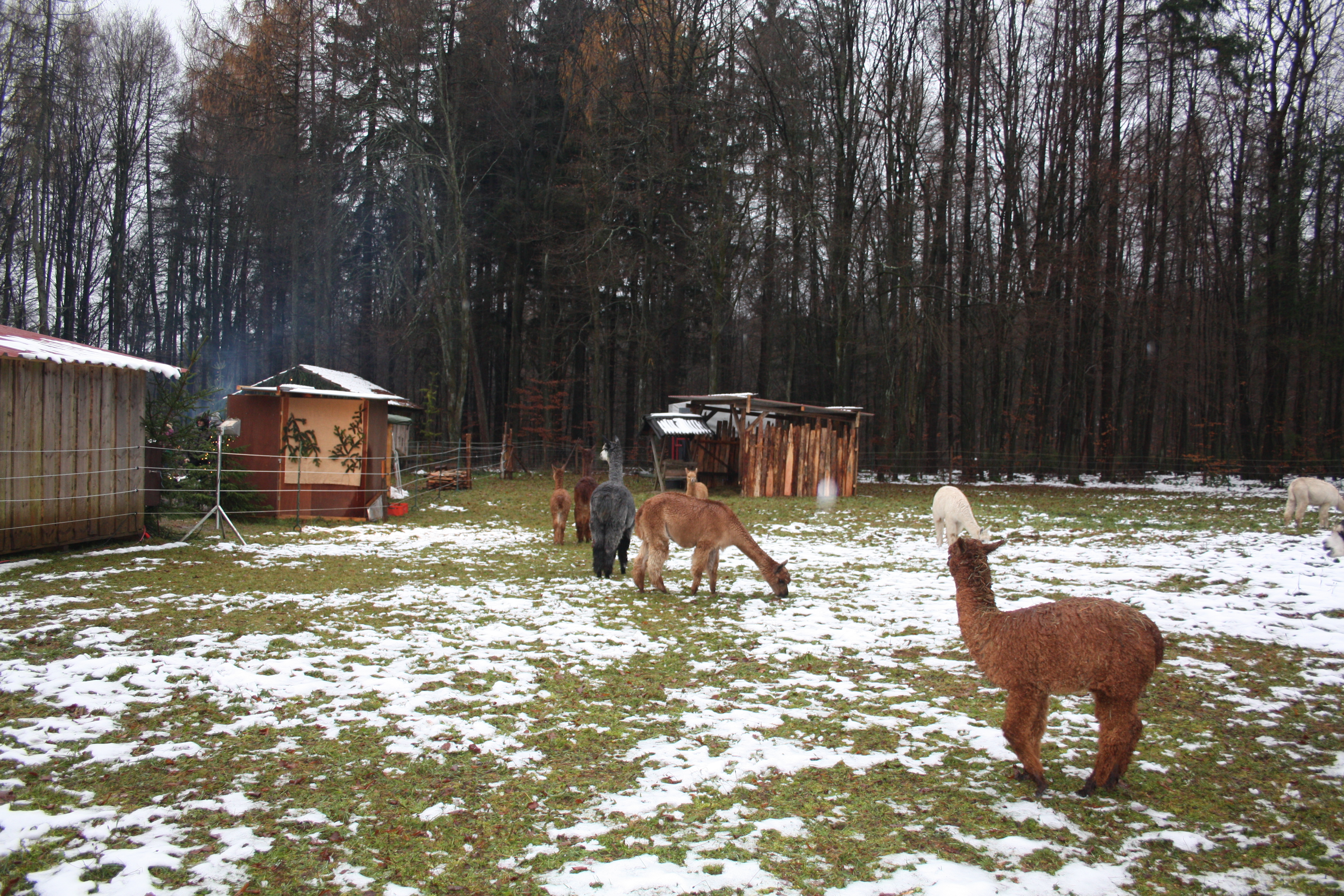 Am nördlichen Rand des Marktes laufen Alpakas in einem großen Gehege.