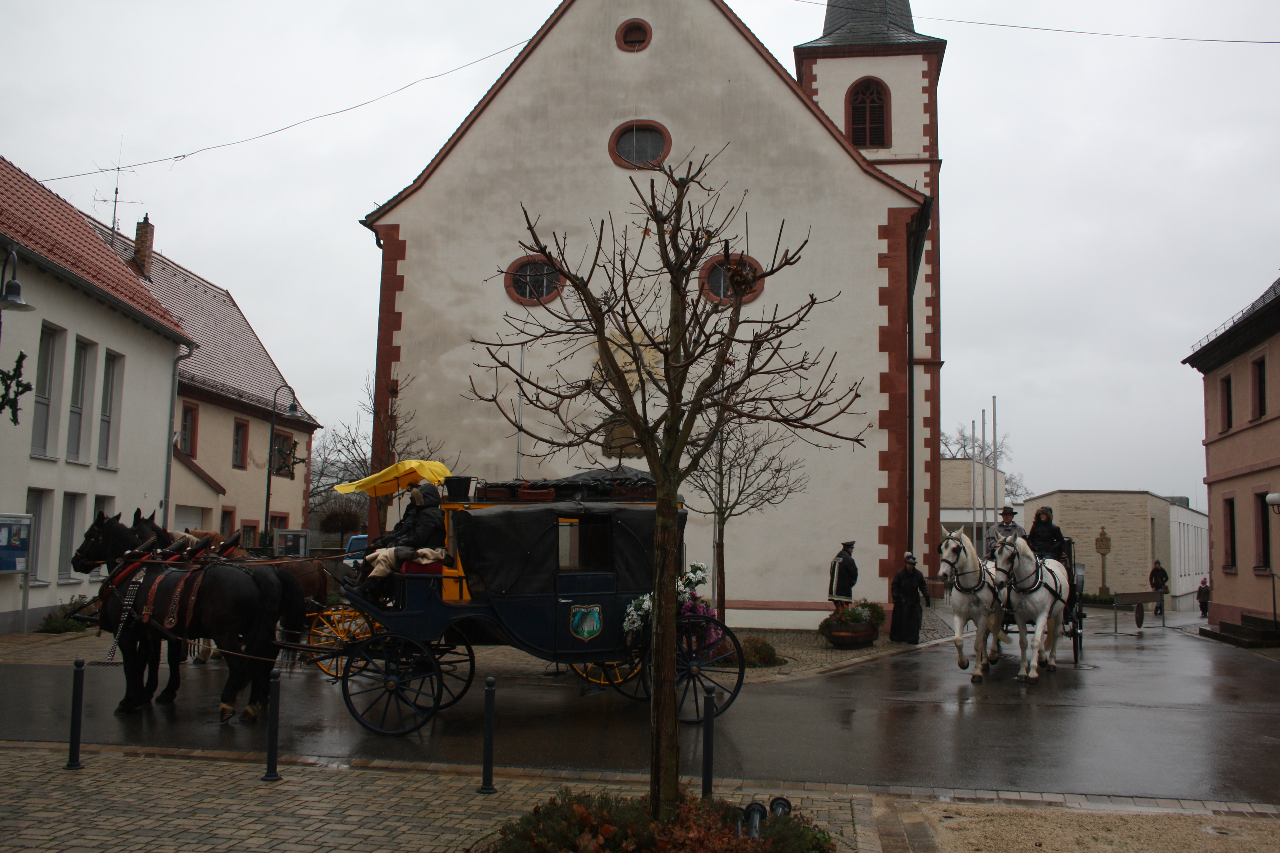 Weihnachtsmarkt Himmelstadt: Die Kutschen fahren vor zum Weihnachtspostamt, vorbei an der Kirche.