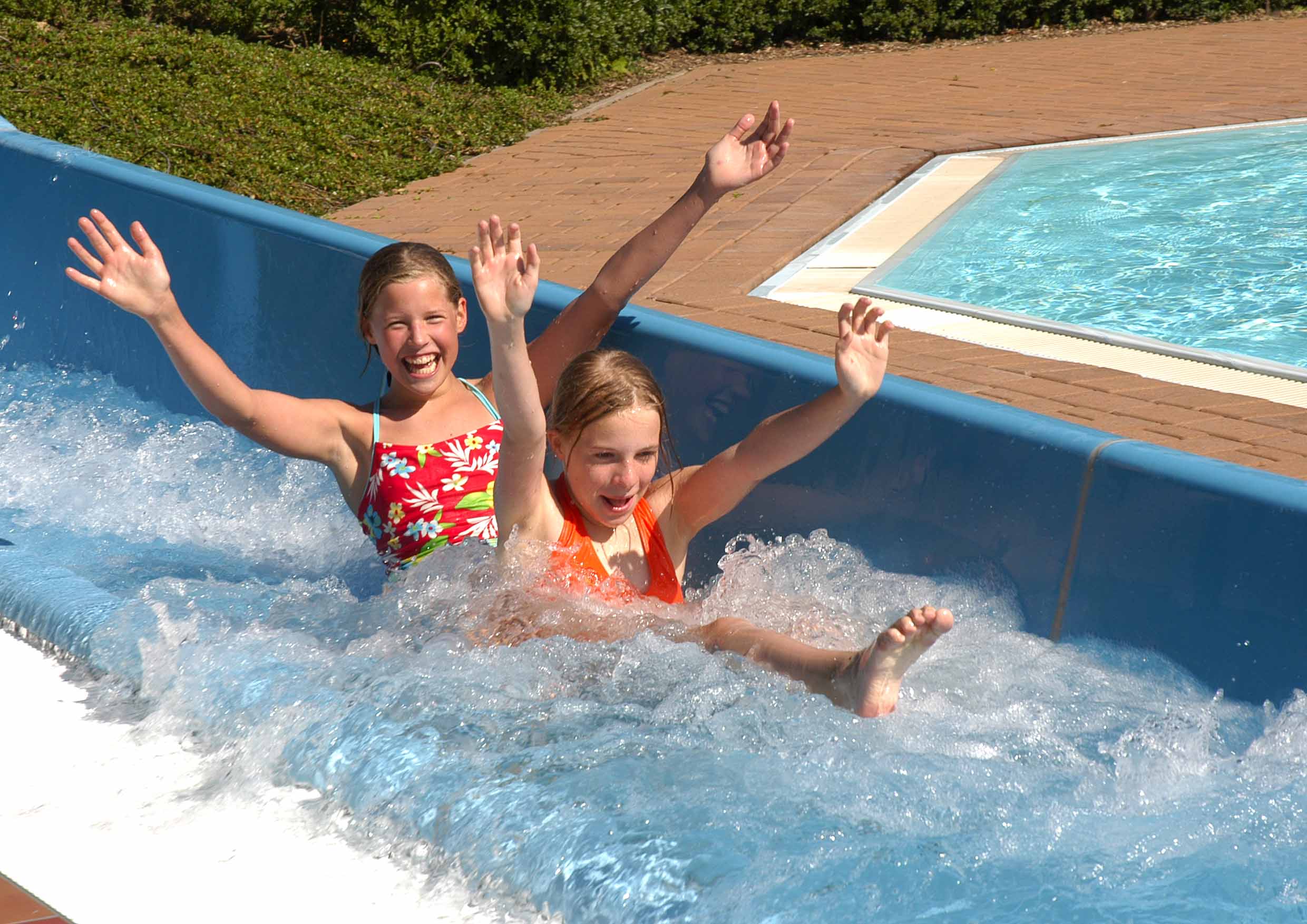 Zwei Mädchen in der Riesenrutsche im Silberbornbad in Bad Harzburg