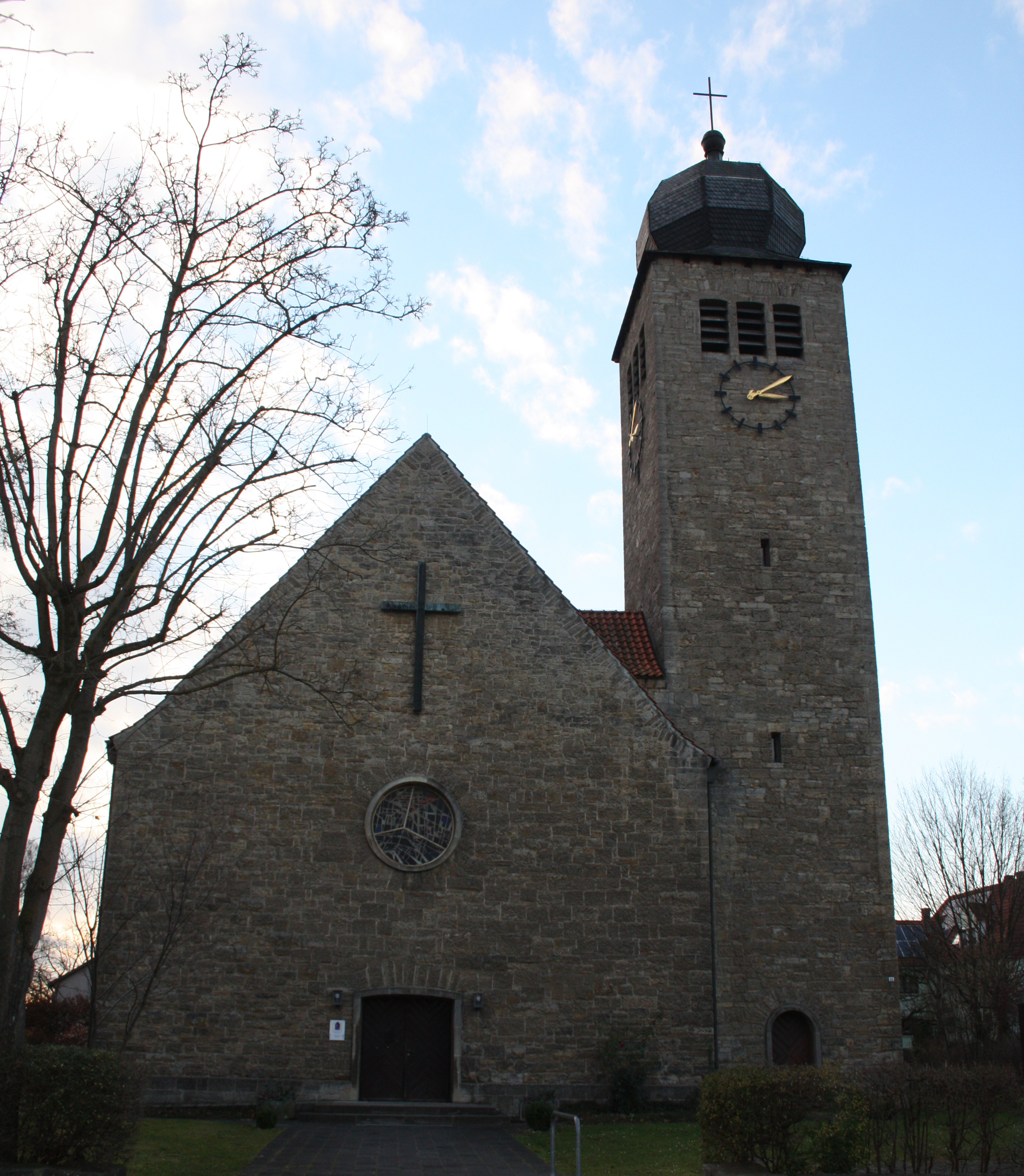 Die evangelische Christuskirche ist ein Saalbau mit Satteldach aus Bruchstein.