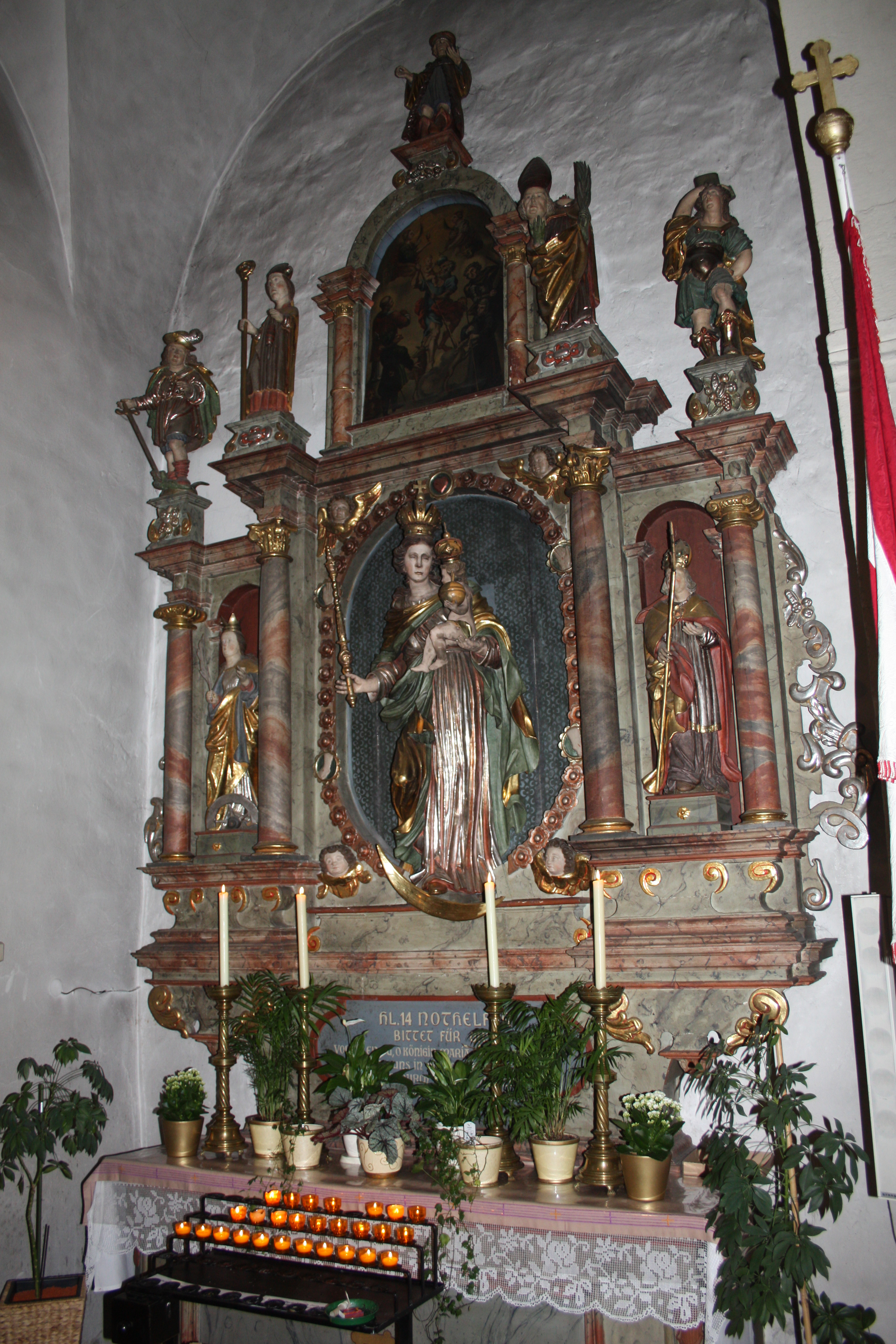 Der Rosenkranzaltar im linken Arm des Querhauses mit Barock-Madonna und Darstellungen der 14 Nothelfer stammt aus dem Jahre 1719.