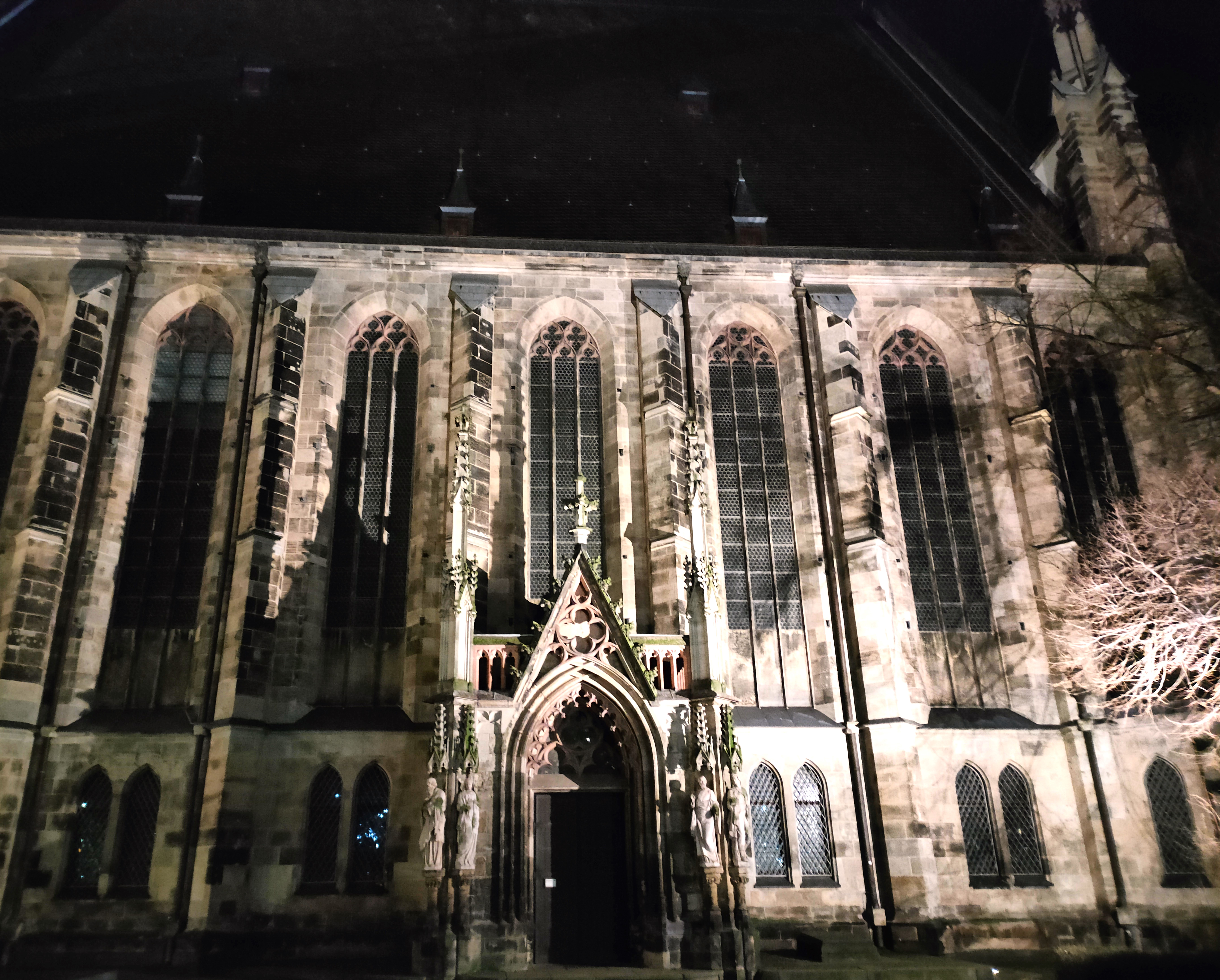 Das Apostelportal der Thomaskirche in Leipzig bei Nacht.