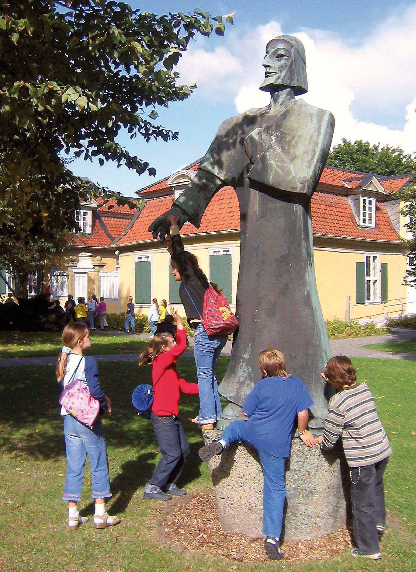 Lessinghaus mit Plastik ''Nathan der Weise'' in Wolfenbüttel