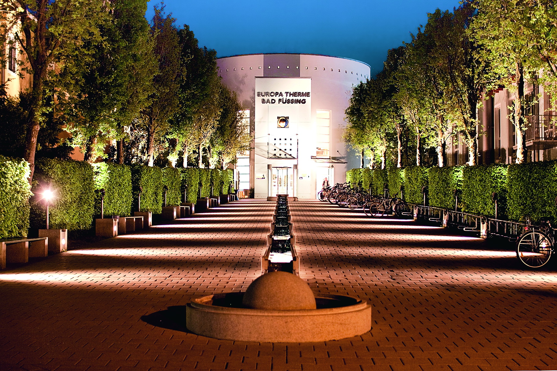 Aussenansicht der Europa Therme bei Abenddämmerung.