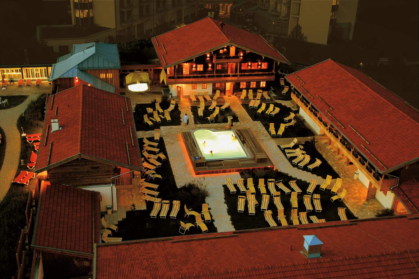 Luftaufnahme bei Nacht des Saunahof Bad Füssing.