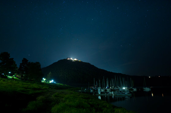 Der Edersee und Schloss Waldeck bei Nacht.