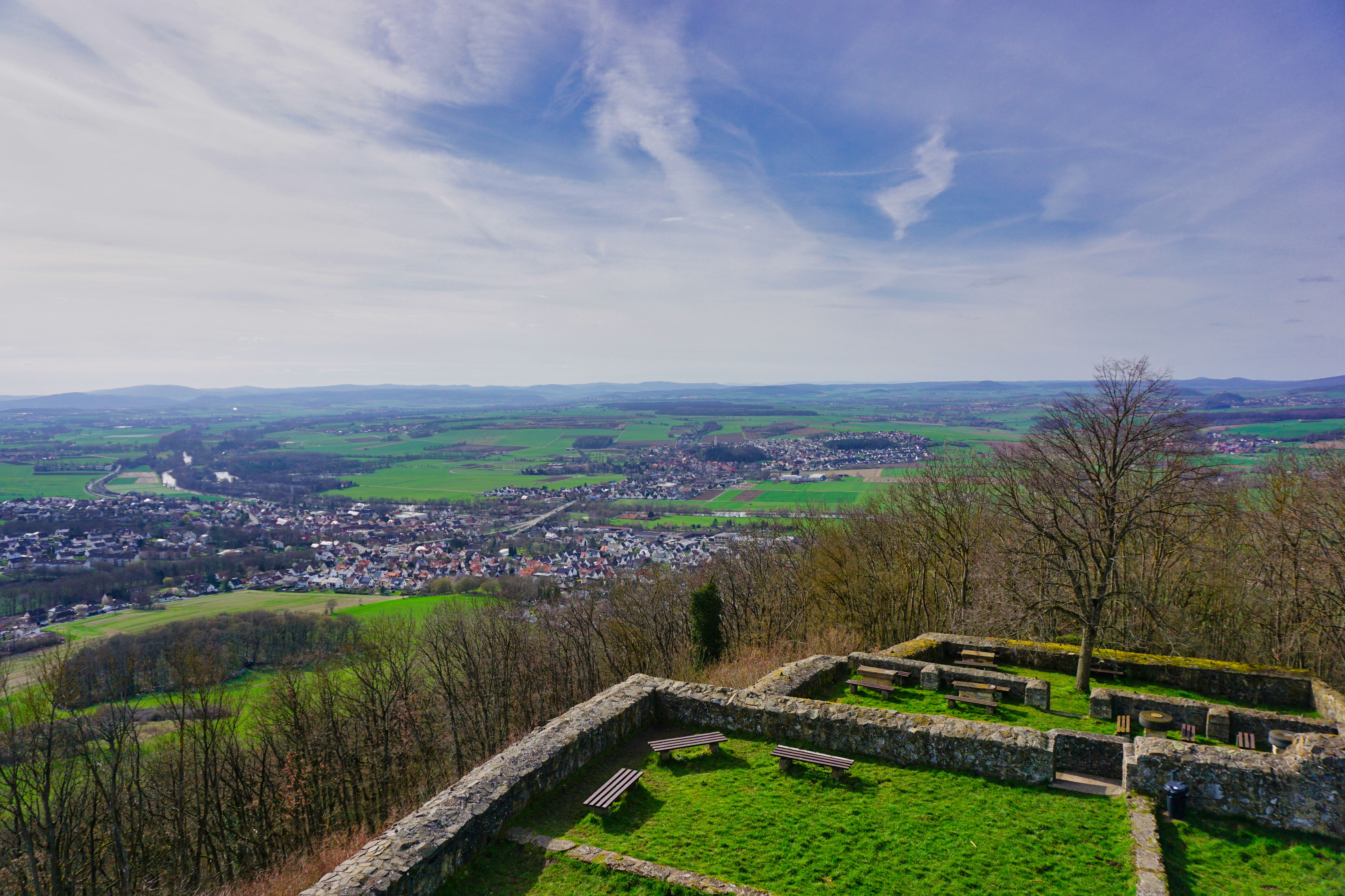 Hier mit Blick auf Mauerreste der Hauptburg und dahinter auf die Stadt Felsberg.