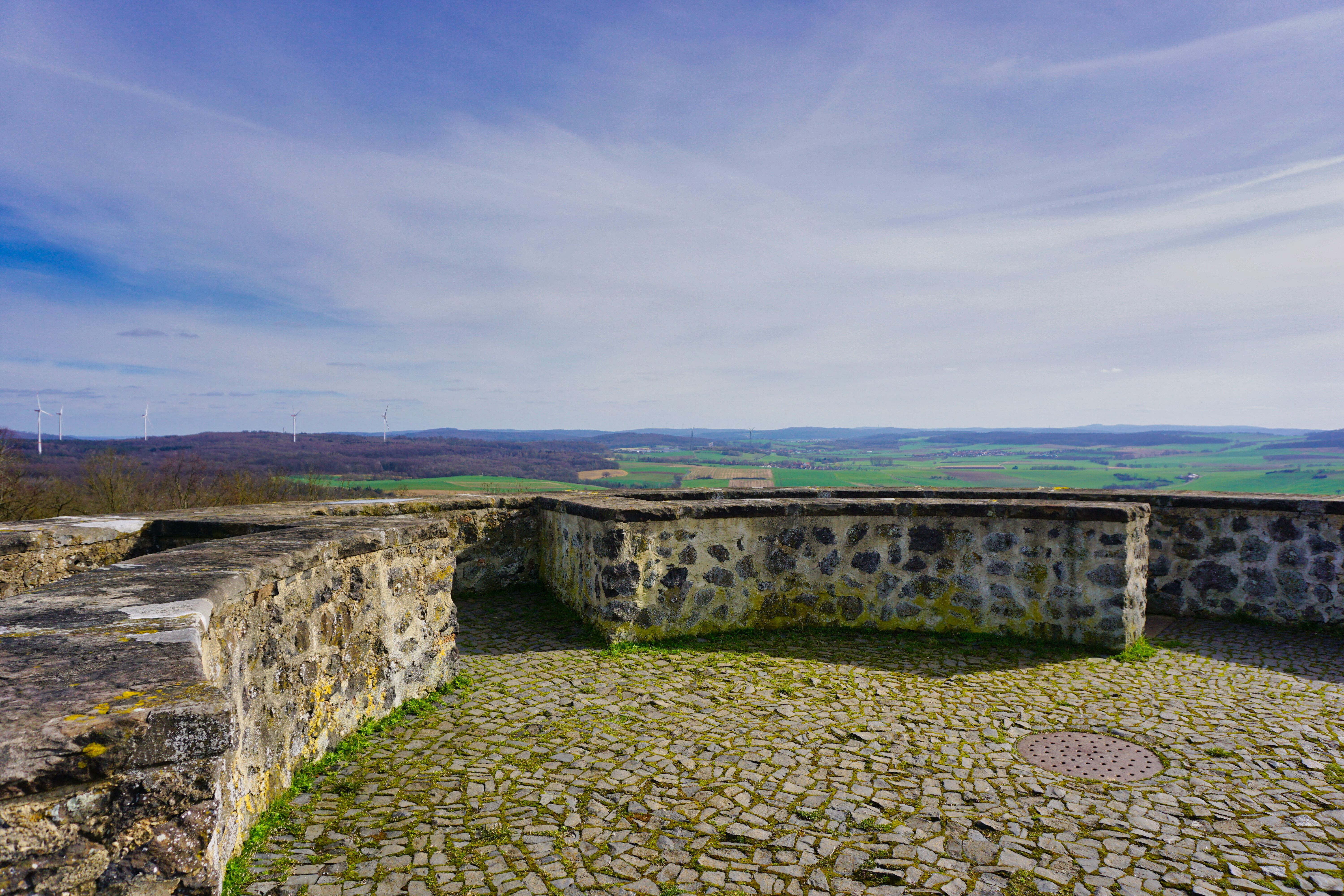 Oben auf dem Bergfried der Burg Heiligenberg, Felsberg.