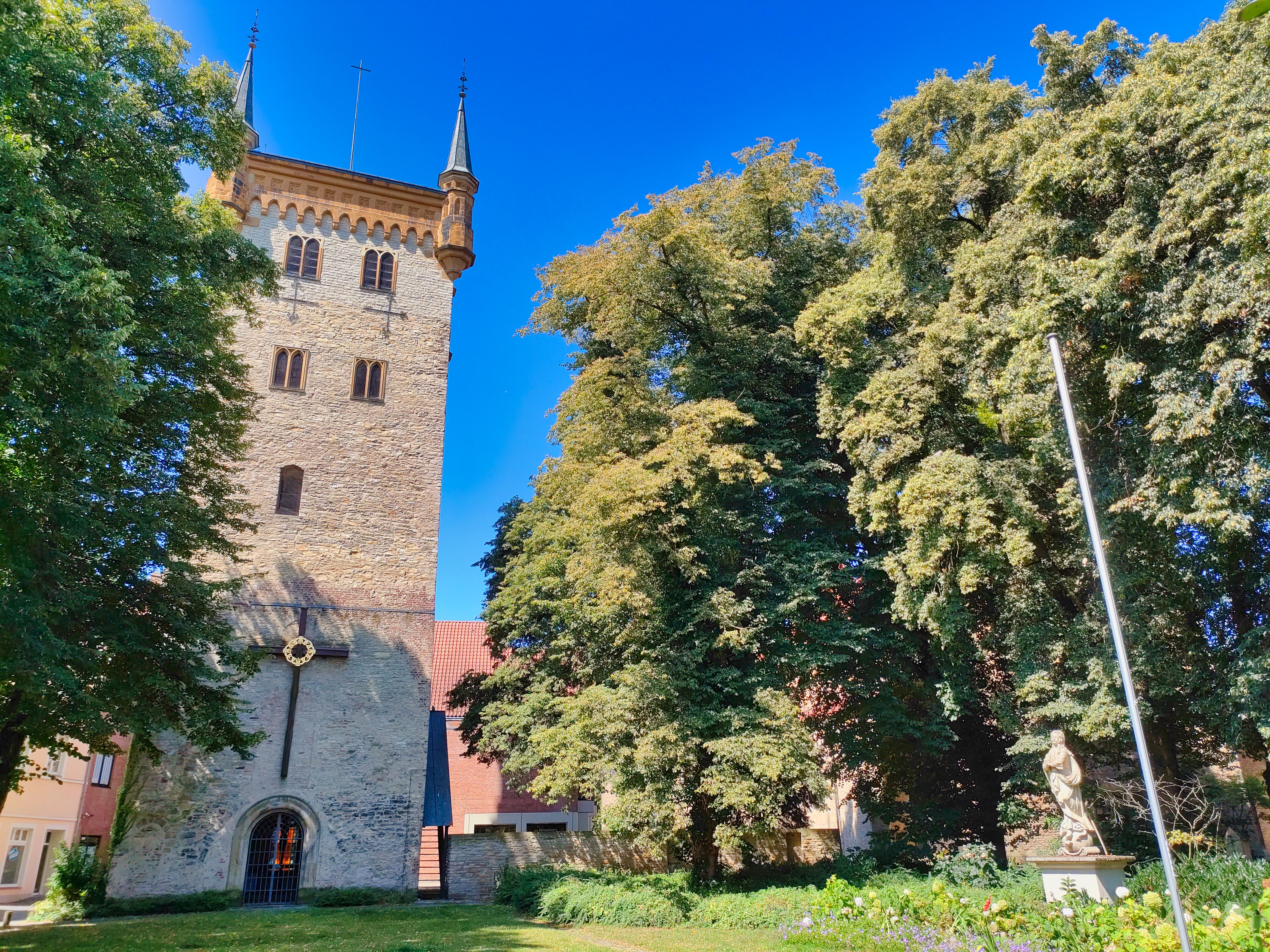Der Turm einer älteren Kirche neben der Marienkirche in Warendorf.