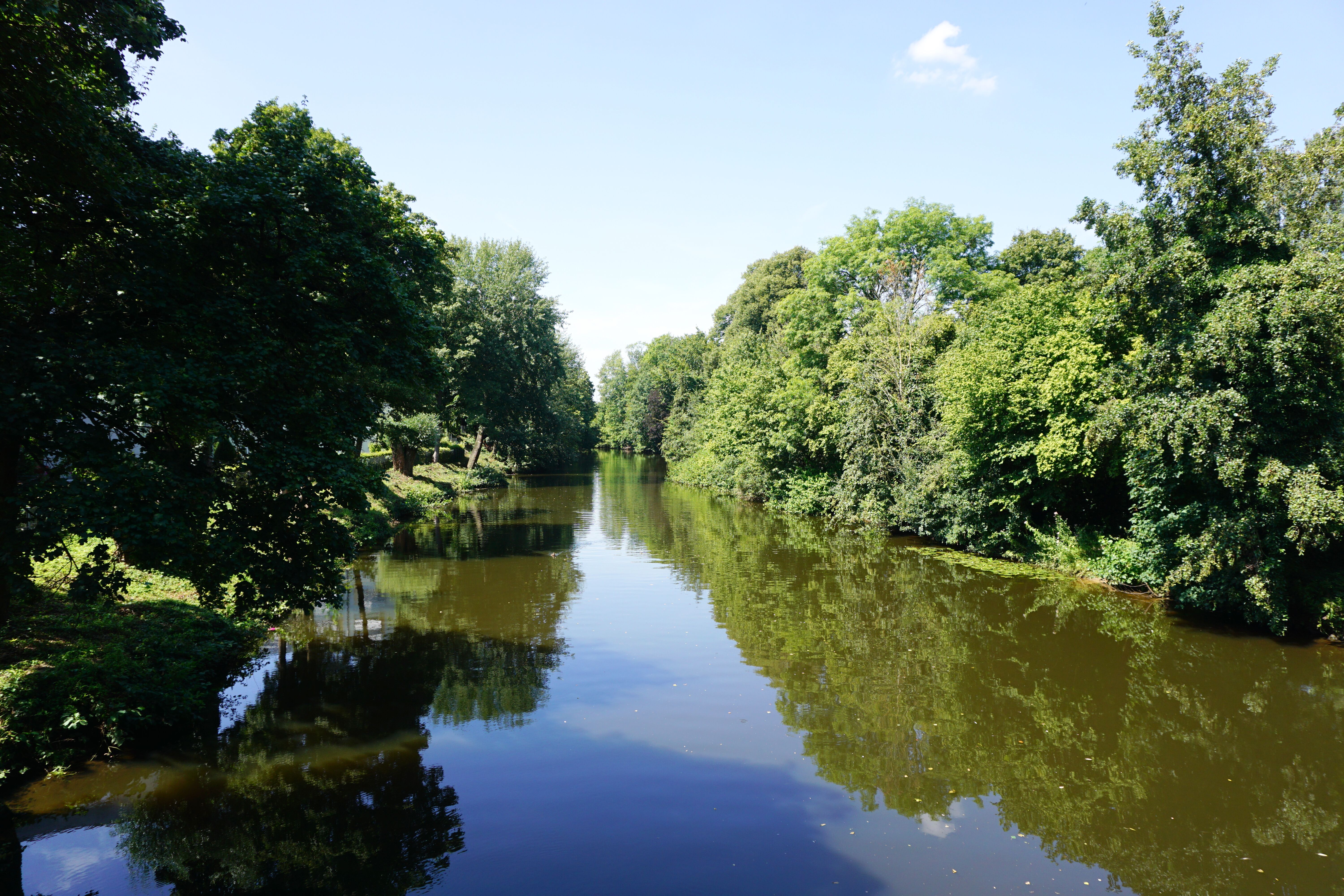 Die Ems fließt idyllisch durch den Emsseepark von Warendorf.