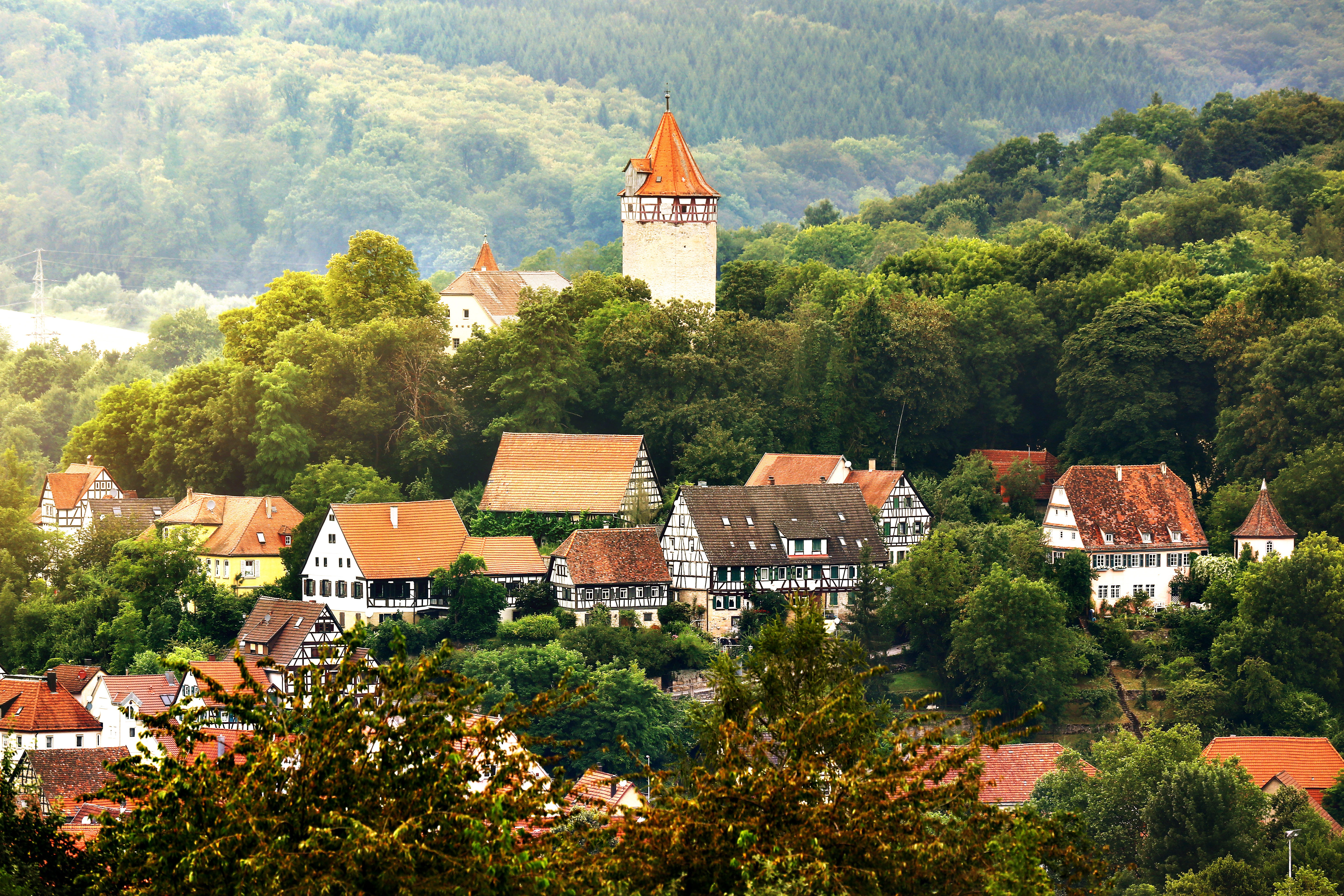 Blick über die Fachwerkstadt Möckmühl mit mittelalterlichem Stadtkern und historischer Stadtmauer.