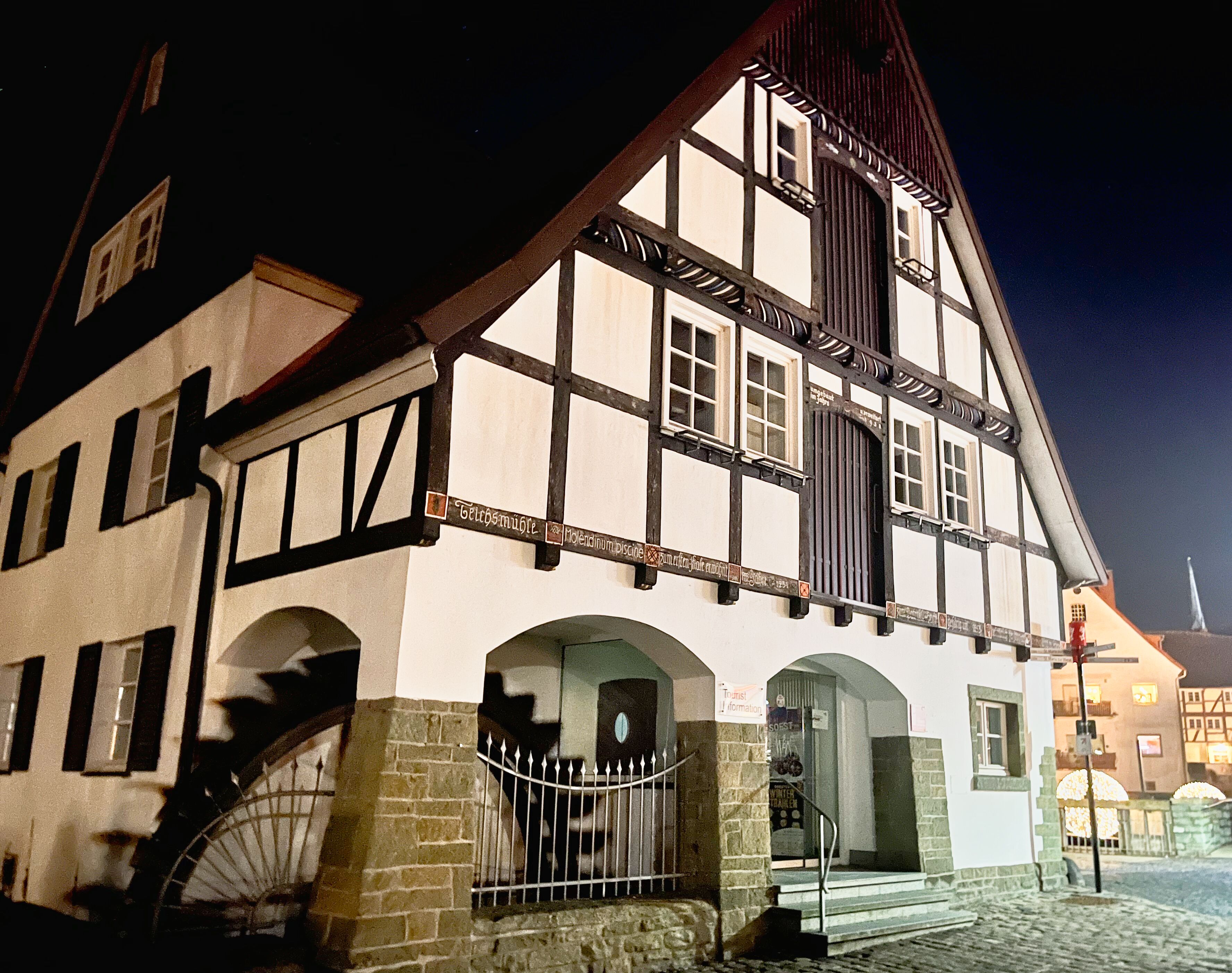 Die Tourist-Info Soest in der Teichmühle bei Nacht.