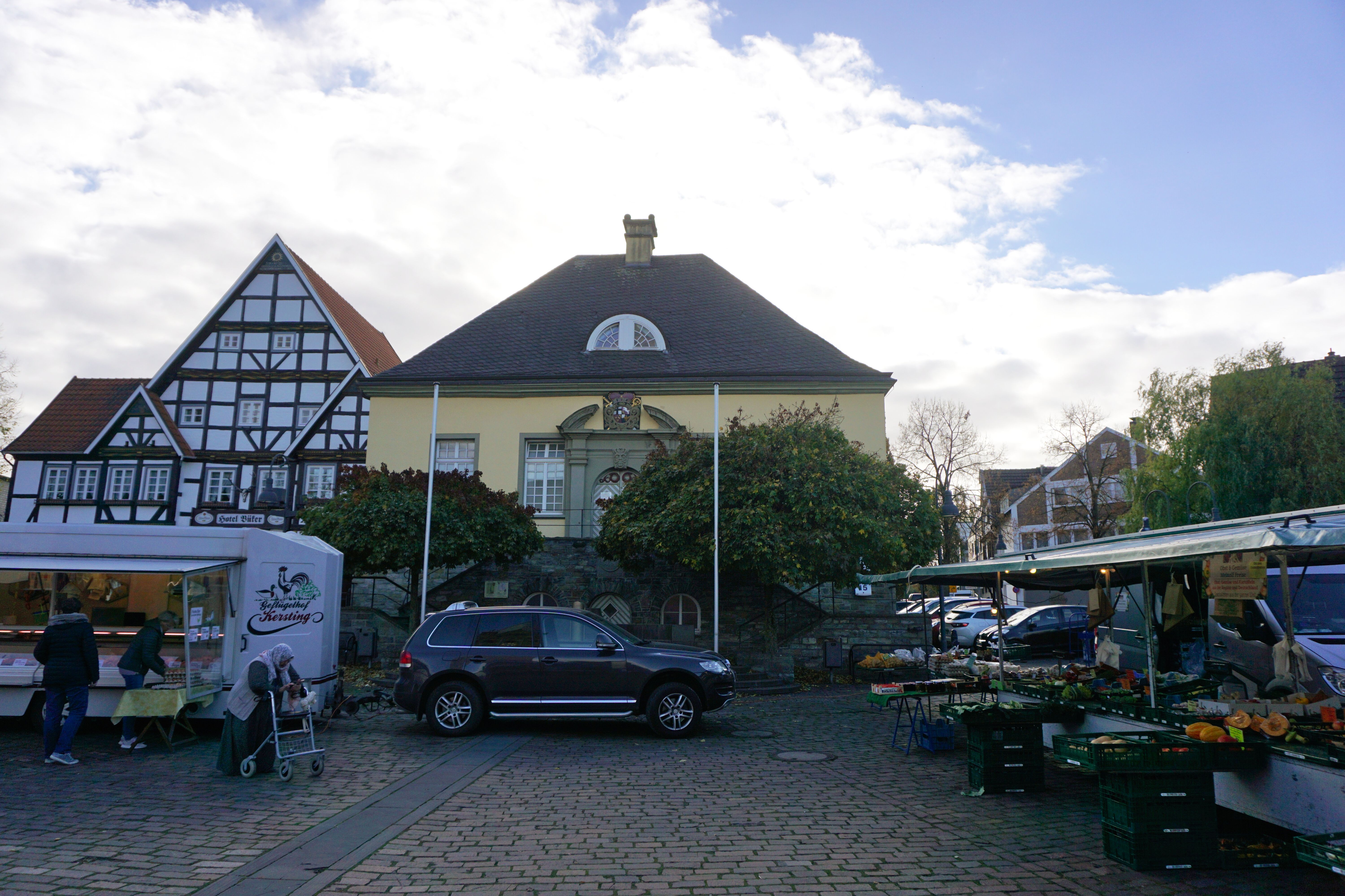 Der kleine Wochenmarkt an der Kirche in Erwitte.