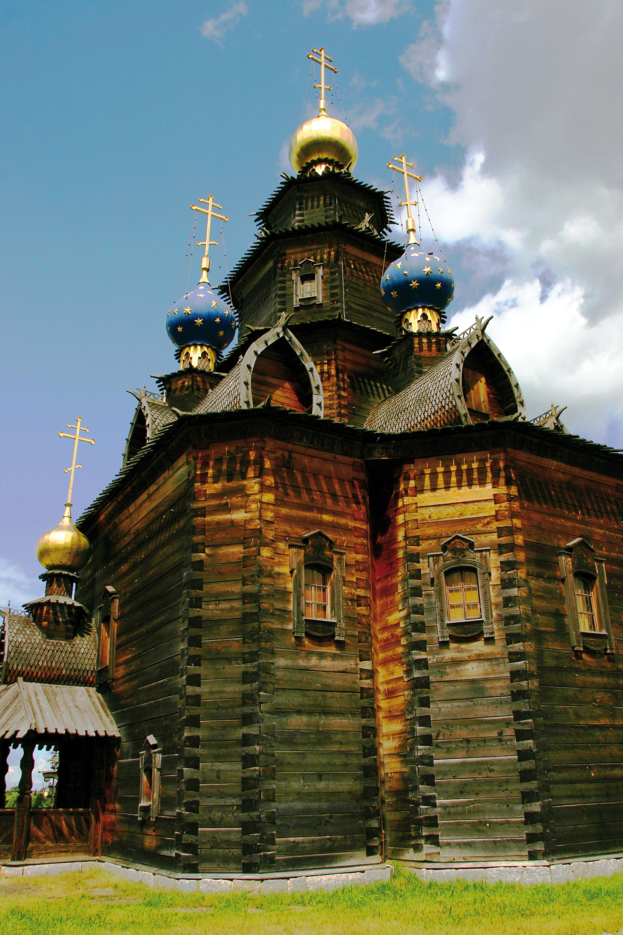 Russisch-orthodoxe Holzkirche in der Südheide Gifhorn. Es handelt sich um die 1756 erbaute Christi-Verklärungskirche aus dem zentralrussischen Dorf Kosljatjewo.