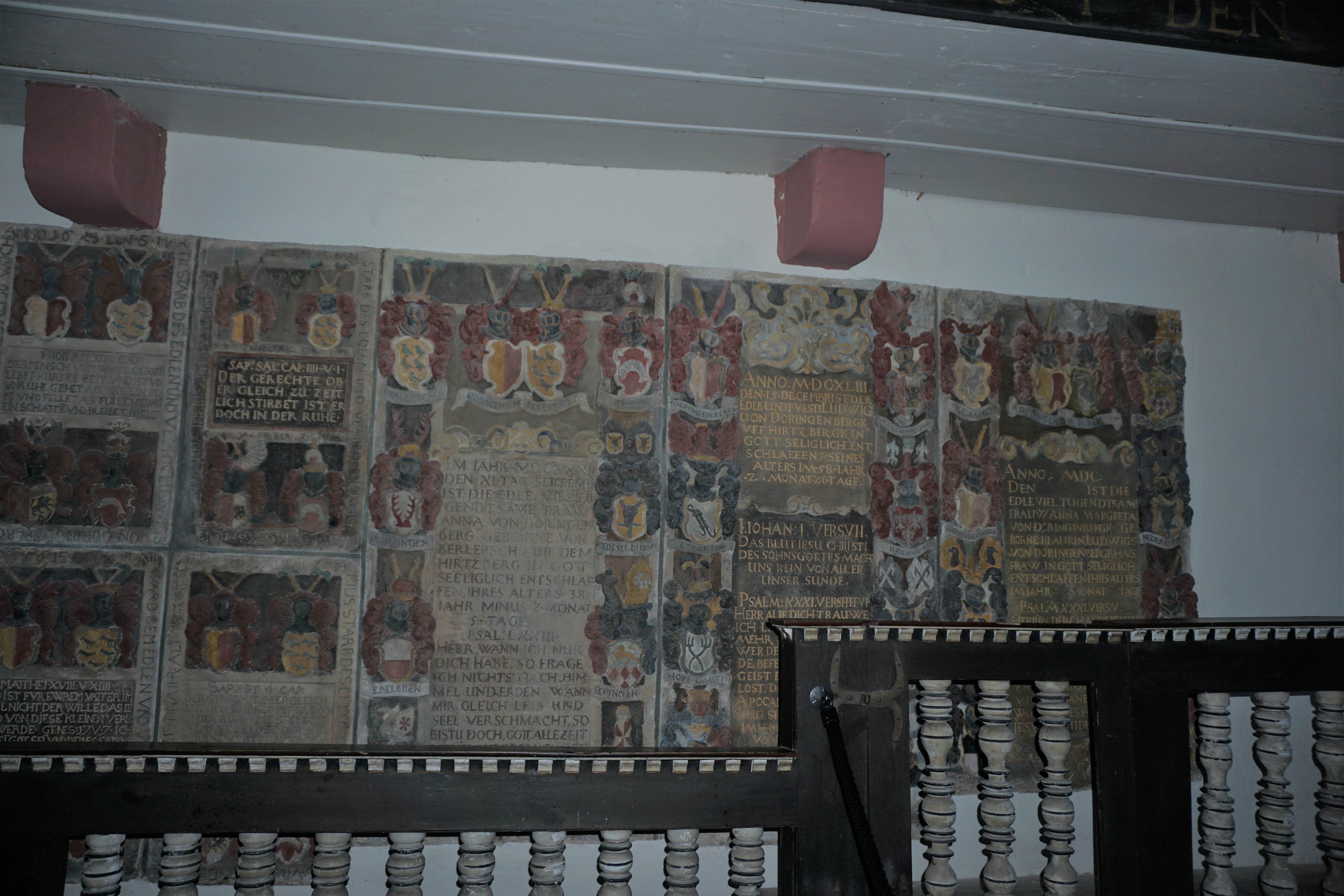 Wandtafeln (auch Epitaphe) in der Burgkapelle der Burg Herzberg.