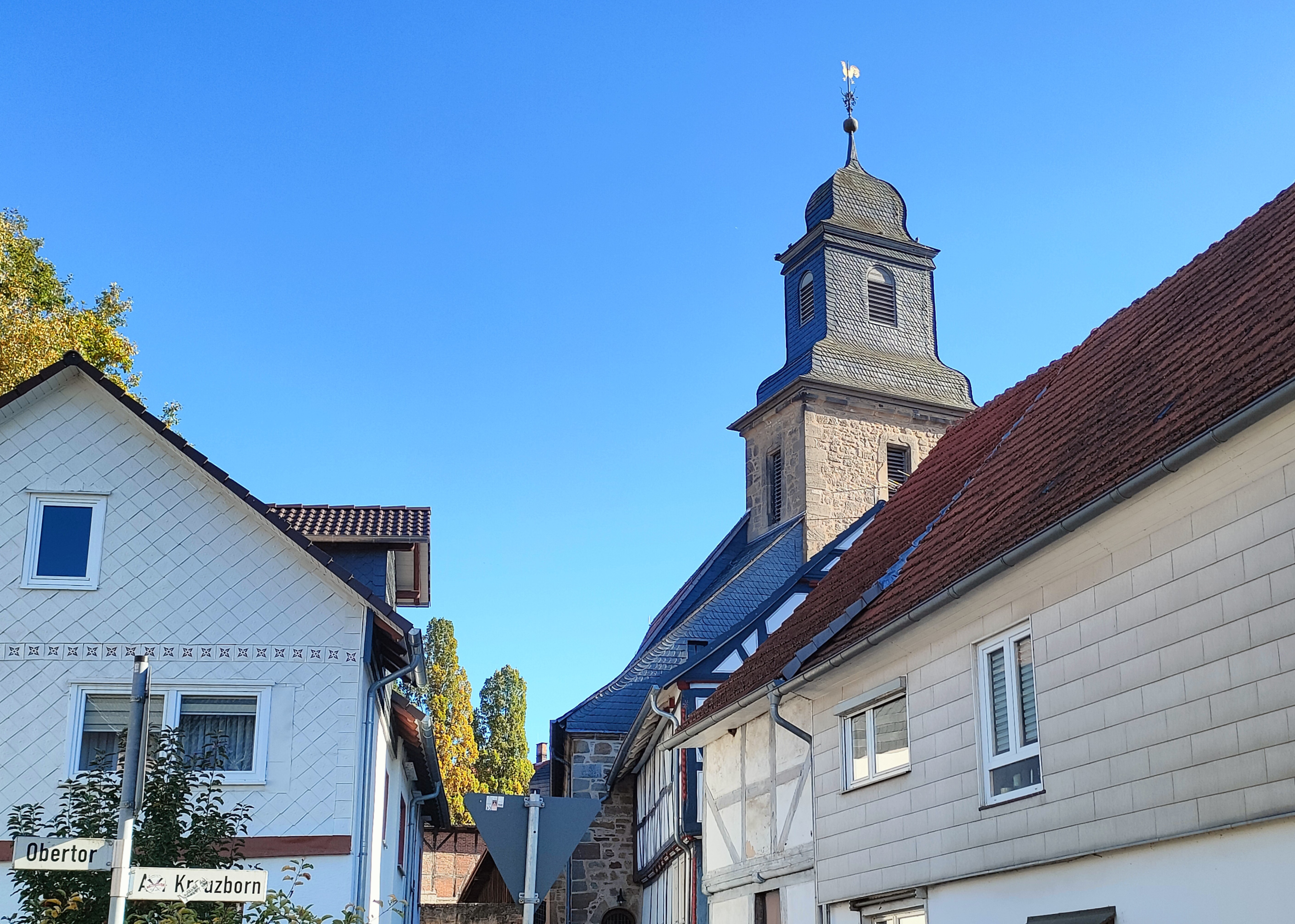 Hier der Turm der Kirche über der Ortsmitte.