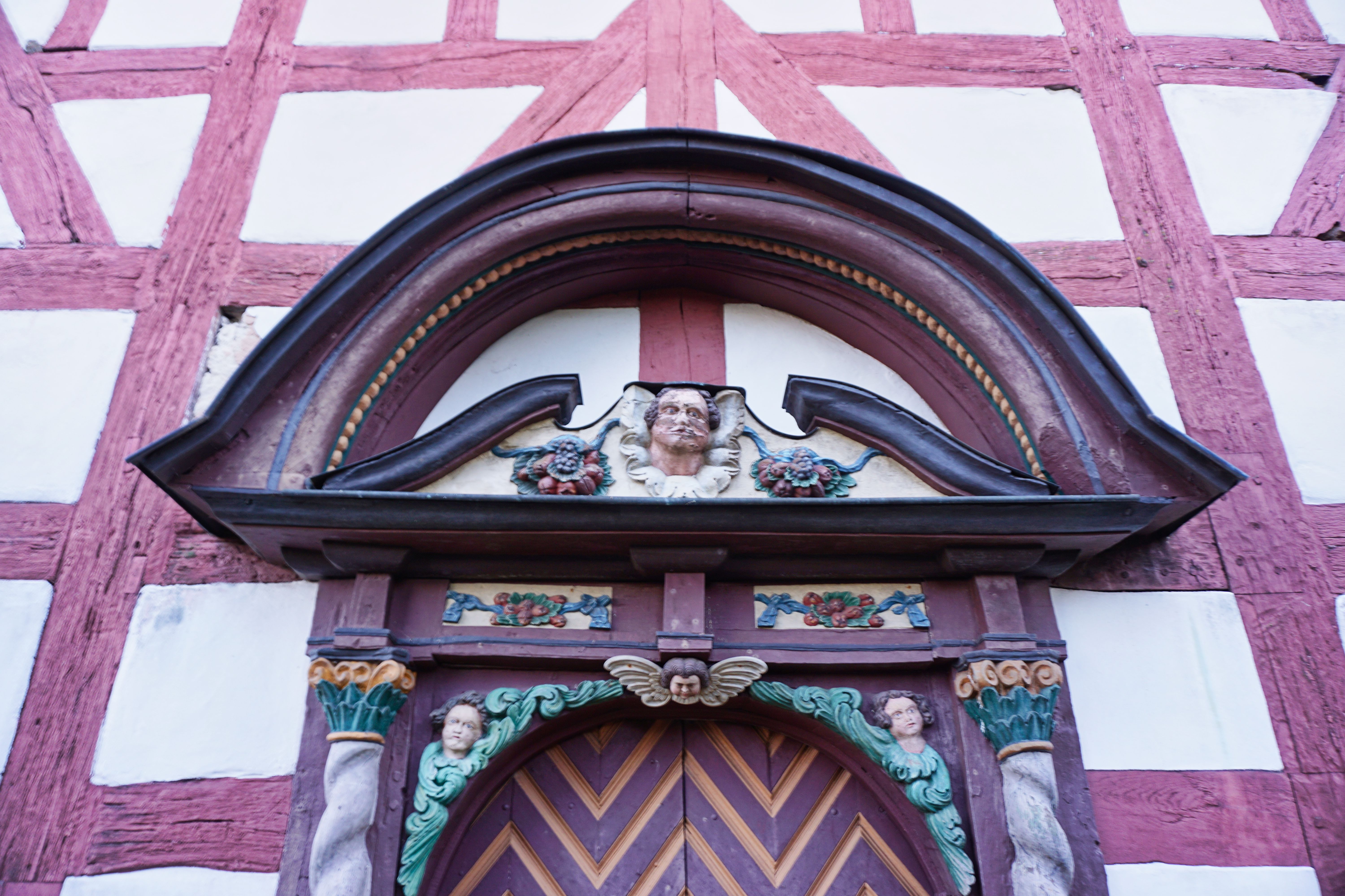 Eingangsportal der evangelischen Fachwerkkirche Stumpertenrod, Feldatal.