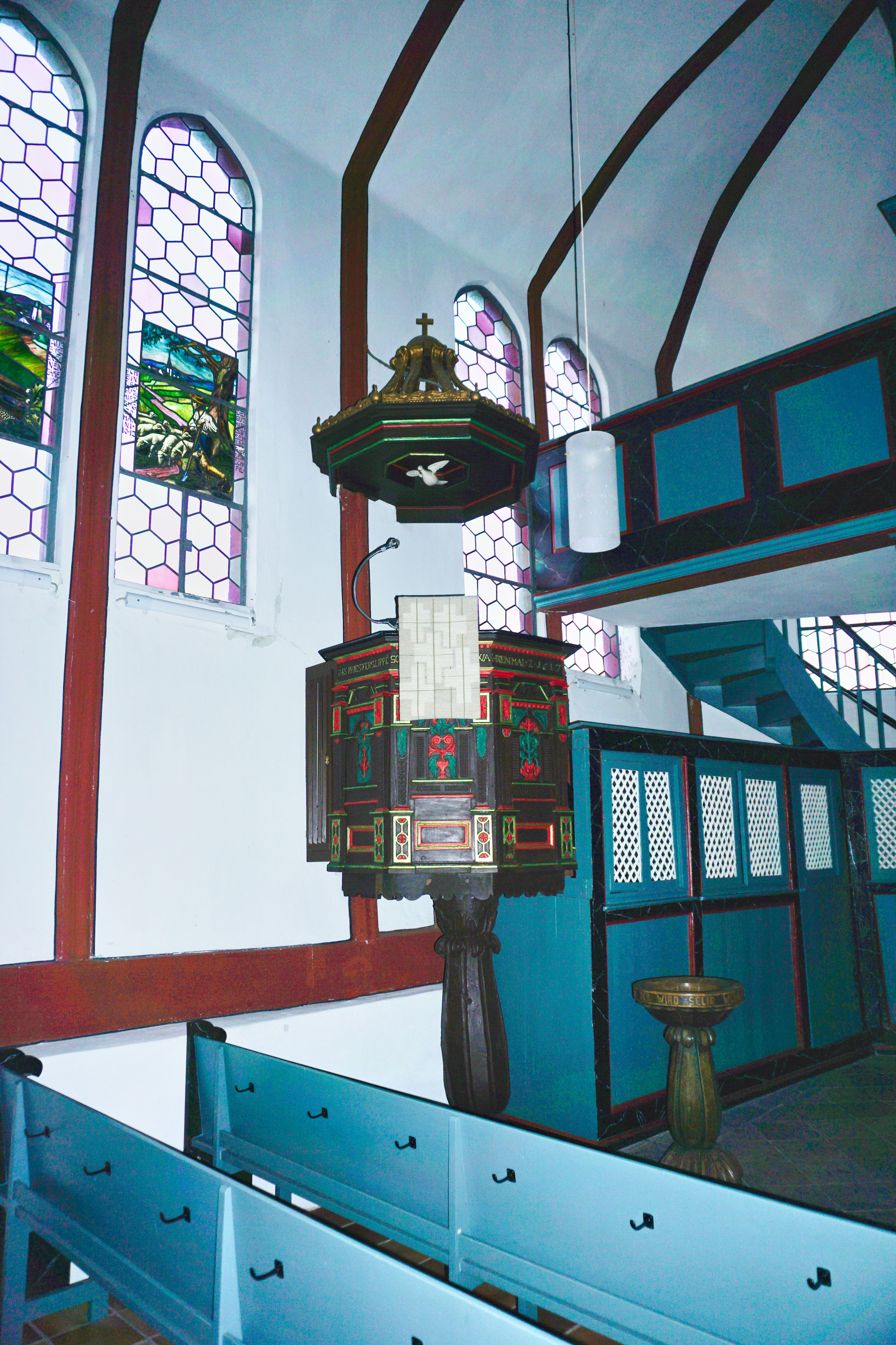 Kanzel der evangelischen Fachwerkkirche Stumpertenrod, Feldatal.