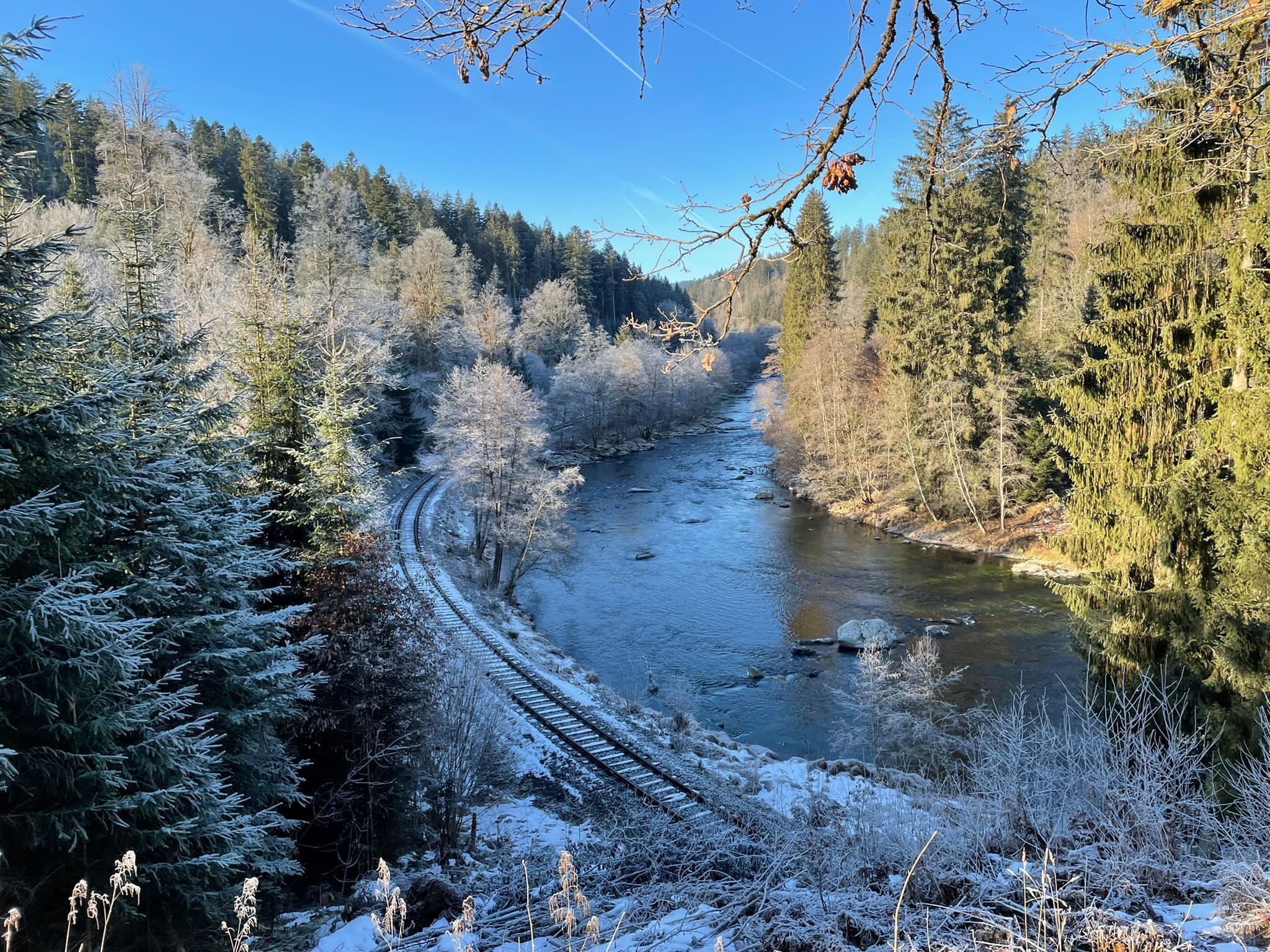 Flusslandschaft und Bahnstrecke Schwarzer Regen bei Kaikenried, Teisnach.
