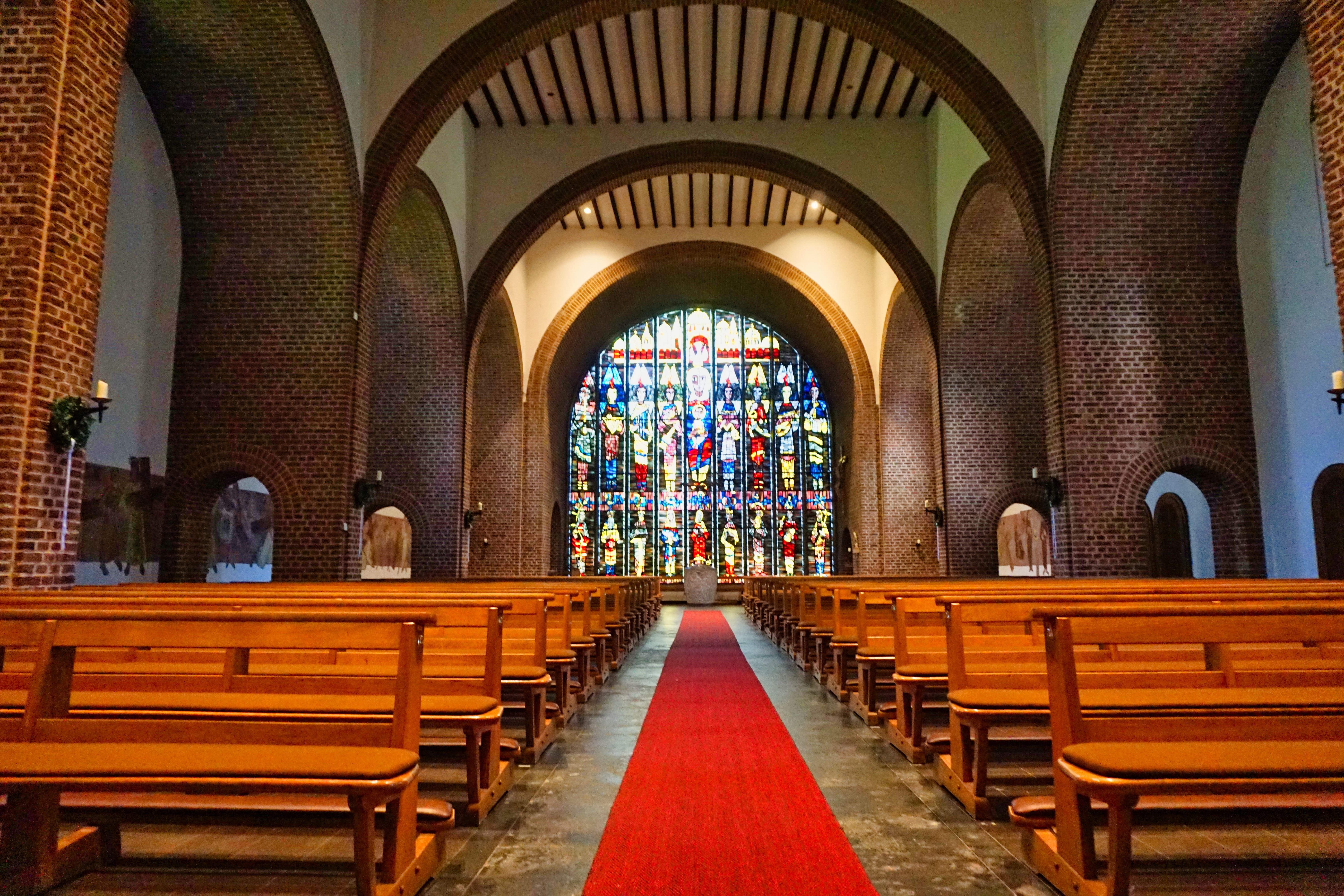 Das große Marienfenster im Raum der Gemeindekirche der Abteikirche Varensell, Rietberg.