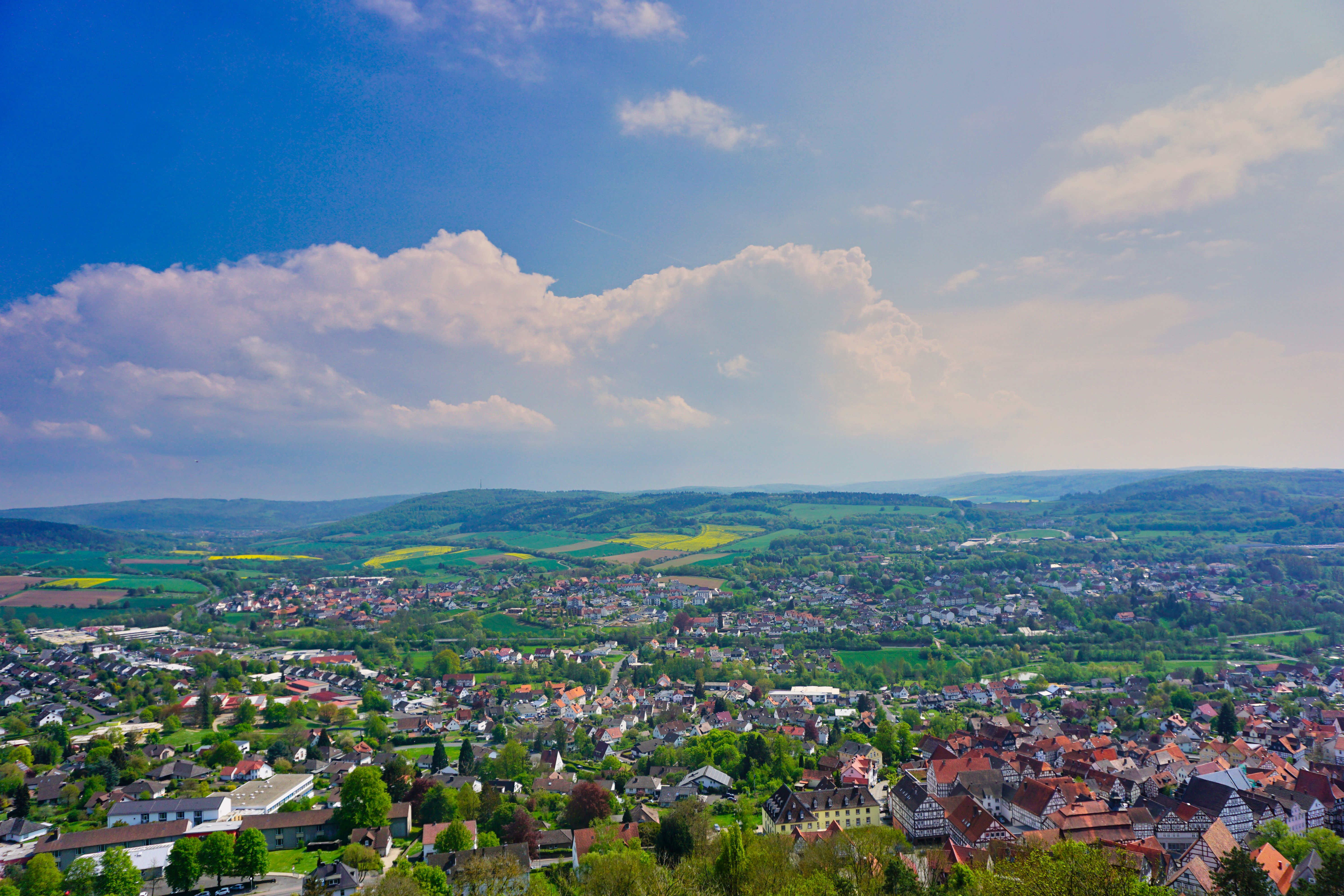 Ausblick vom Burgturm über Homberg (Efze) in Richtung Süd-Westen.