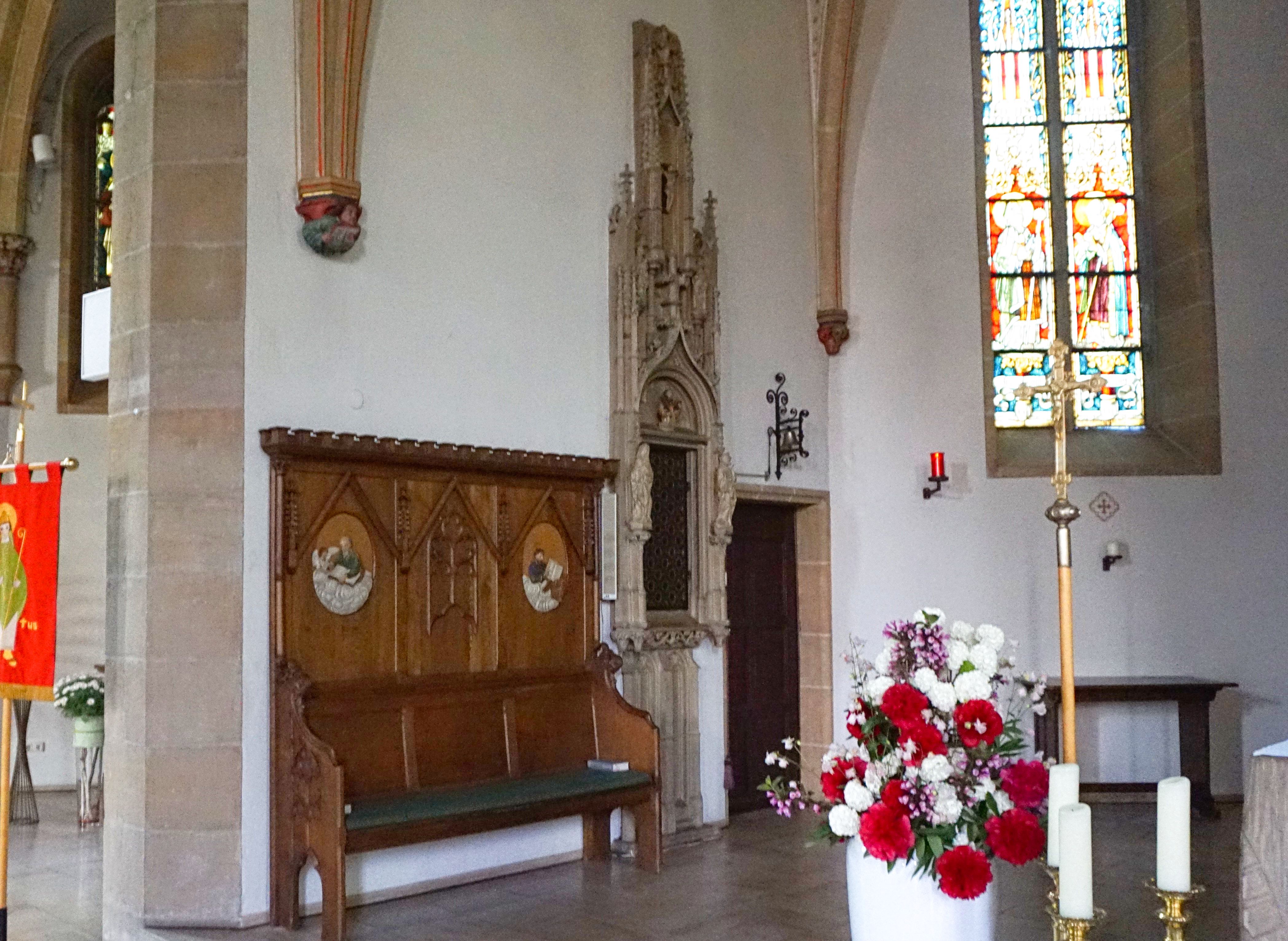 Der hier rechts im Bild zu sehende alte Hochaltar (neben dem Kirchengestühl) konnte 1990-1991 aus Bruchstücken wieder zusammengesetzt werden.