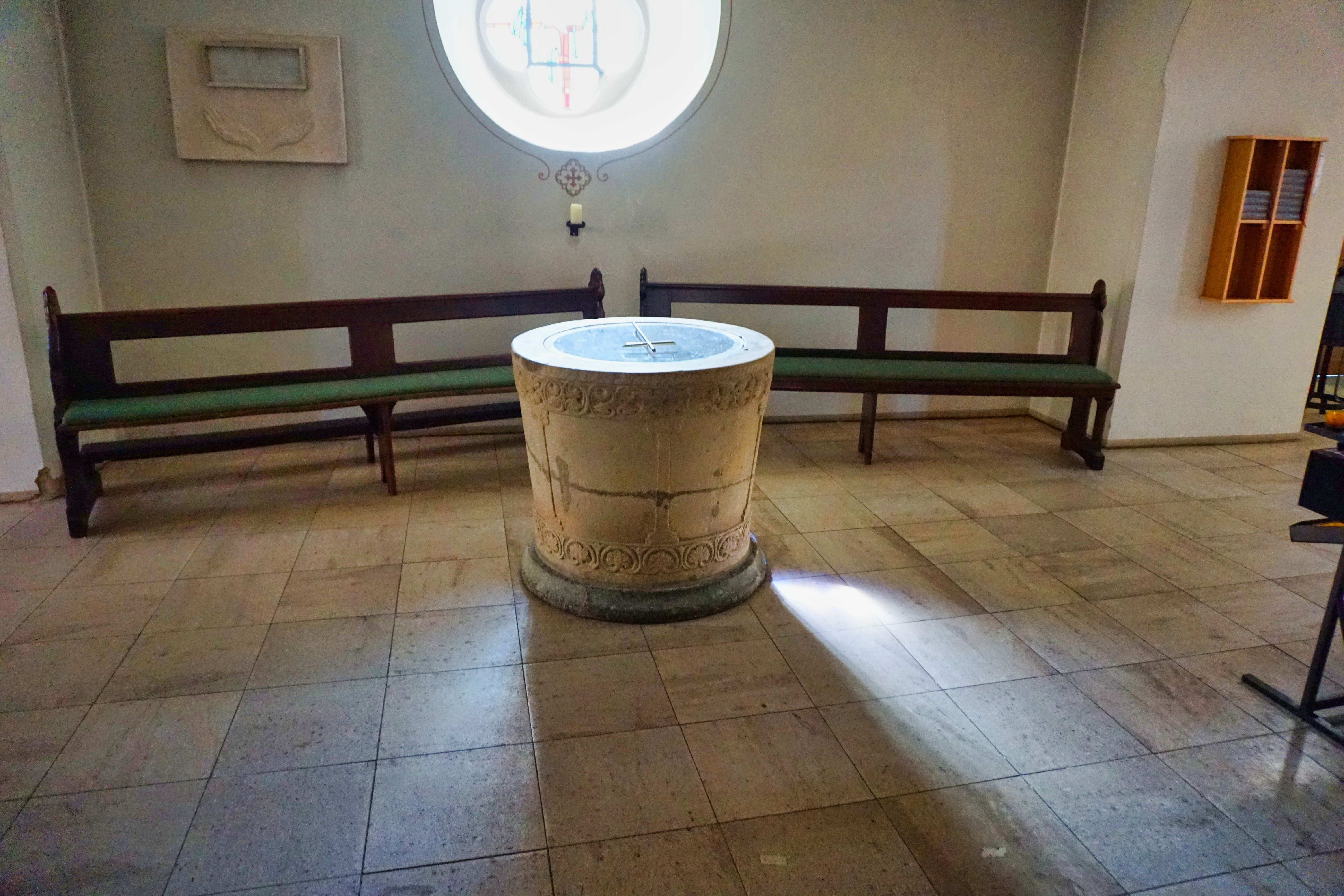 Romanischer Taufstein um 1230 in der Kirche St. Lambertus und St. Laurentius, Langenberg.
