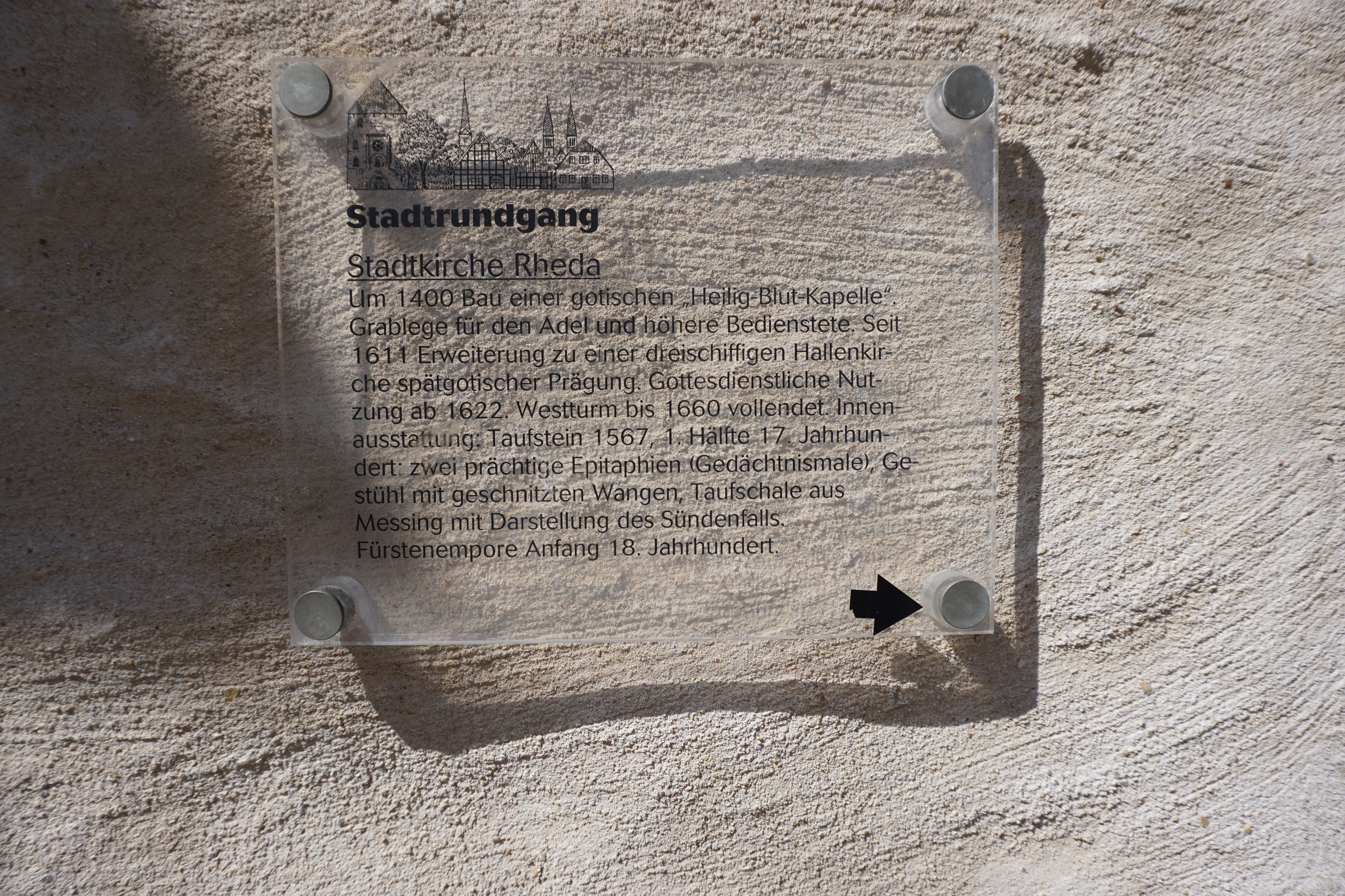 Info-Tafel über die evangelische Stadtkirche Rheda, Rheda-Wiedenbrück.
