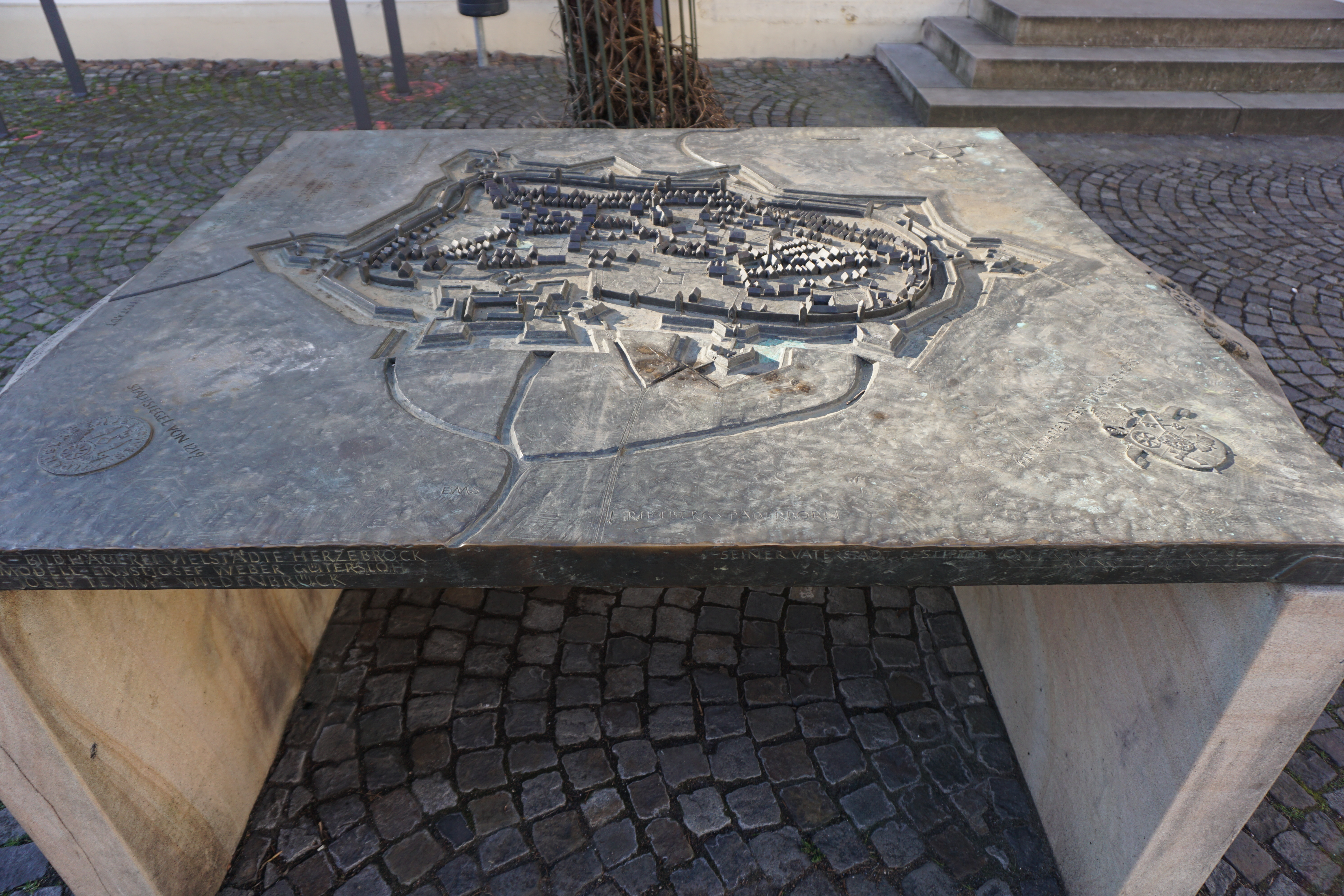 Es zeigt Wiedenbrück als Bronzestadtplan um 1630.