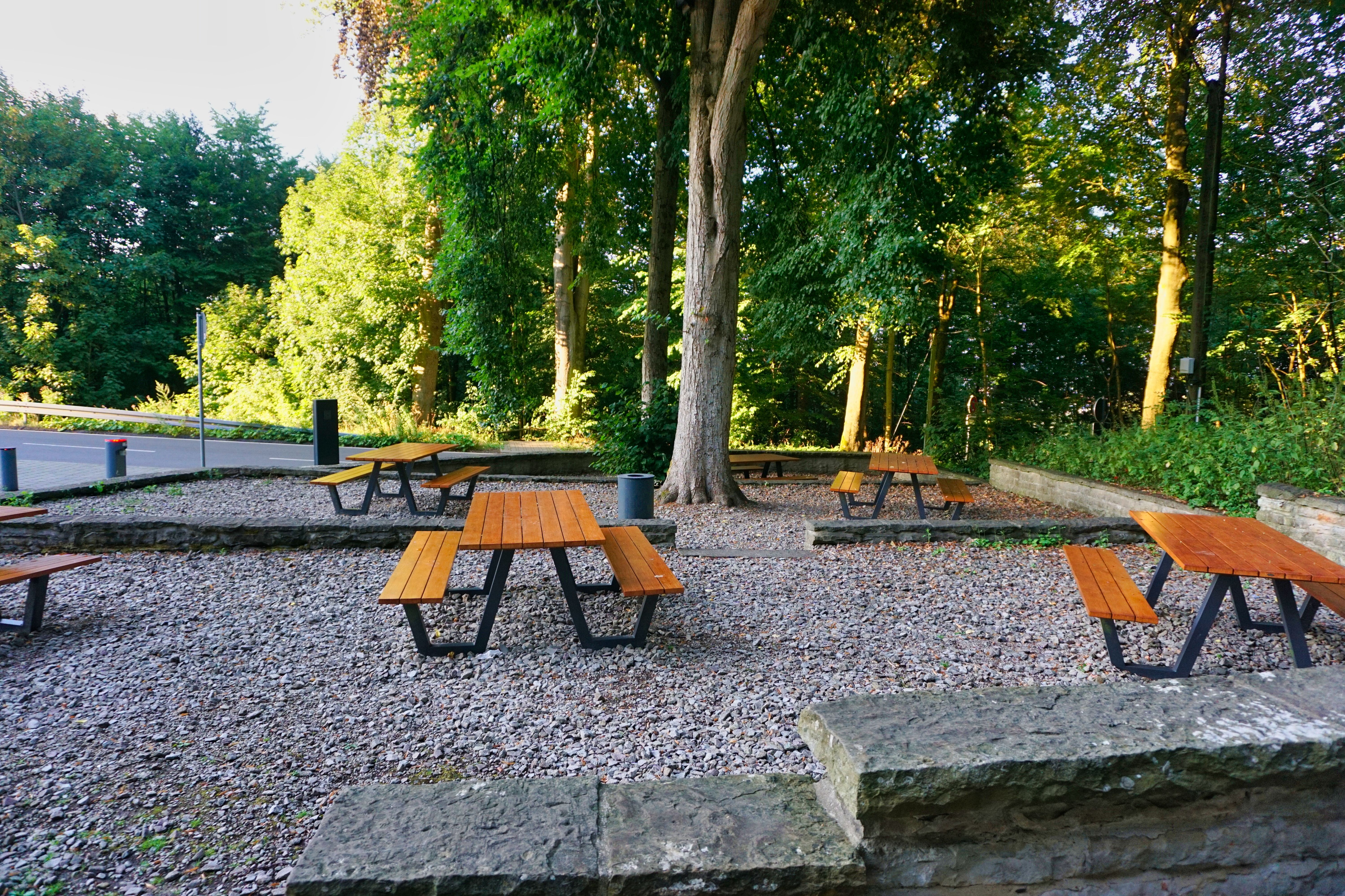 Sitzbänke am Parkplatz, neben dem Souvenir-Shop.