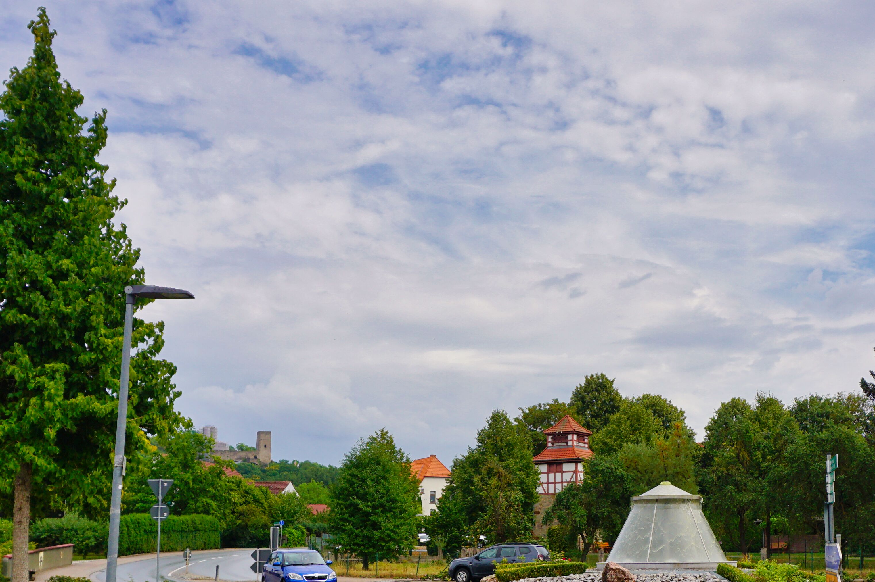 Volkmarsen mit seiner Kugelsburg (links oben im Bild), dem Kreisel am Gleisdreieck und dem alten Trafohaus.