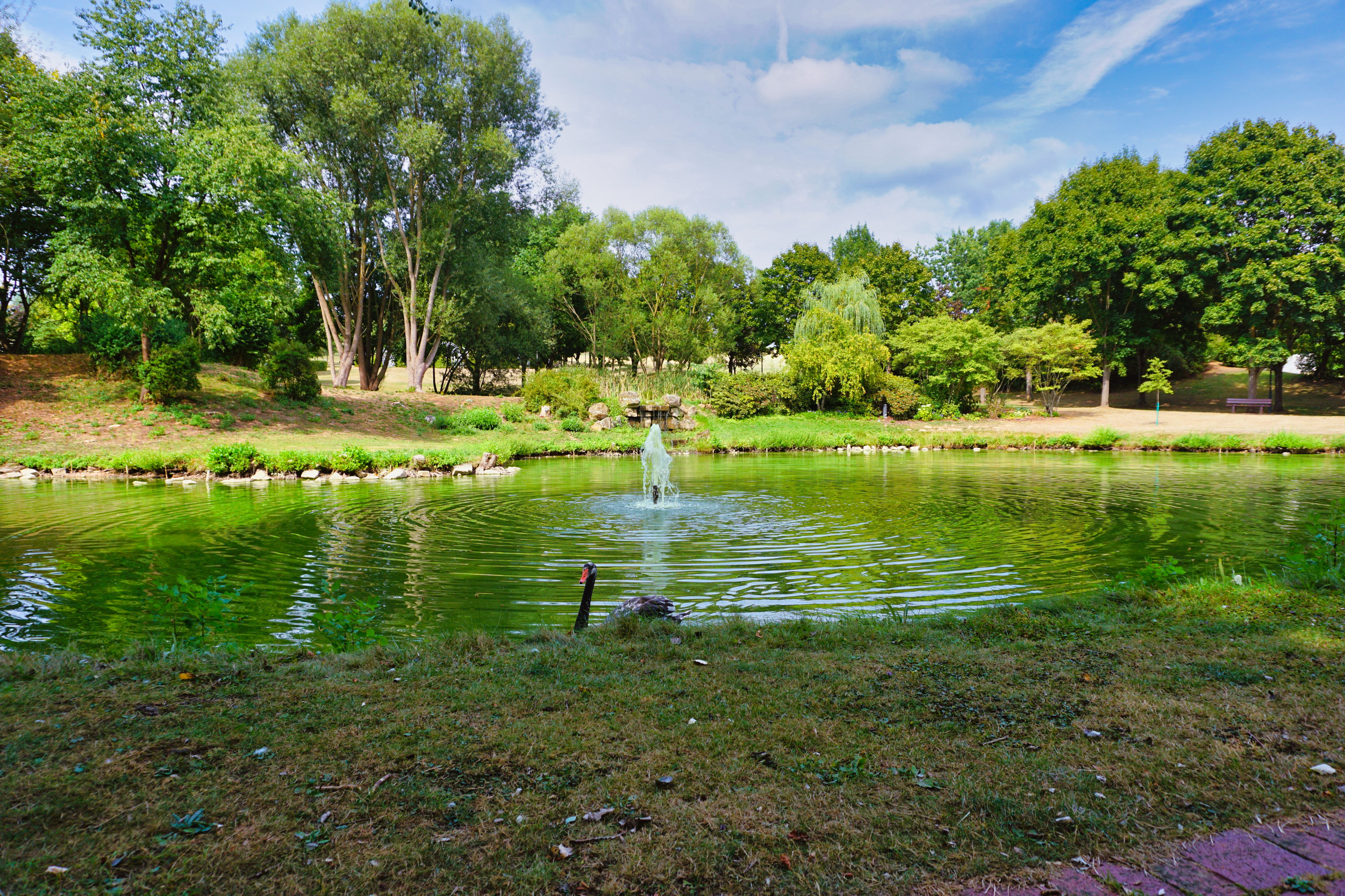 Teich mit Wasserfall und Fontäne im Kurpark von Bad Zwesten.