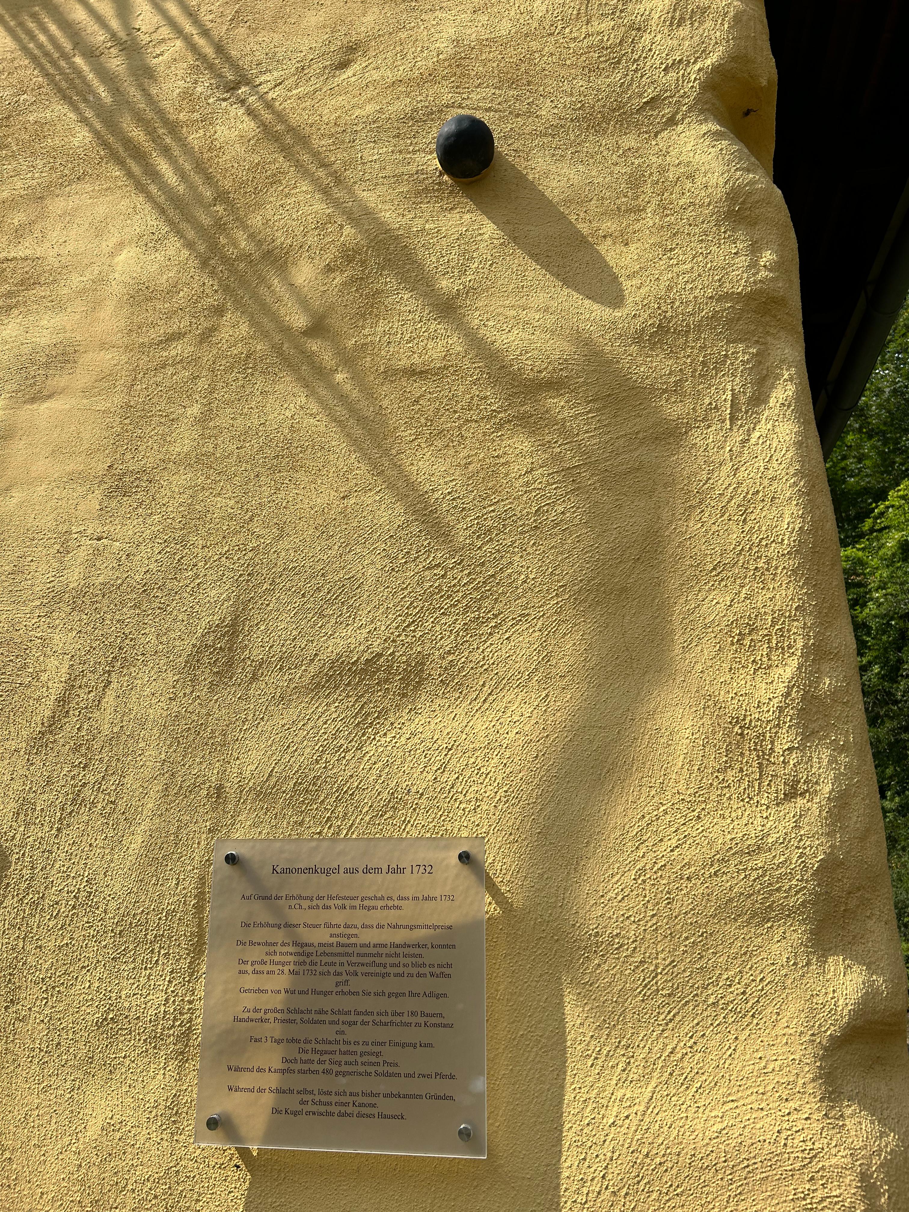 Diese Stelle am Fuss des Hohenkrähen, auf Höhe der Vorburg, zeigt eine Kanonenkugel die 1732 hier einschlug.