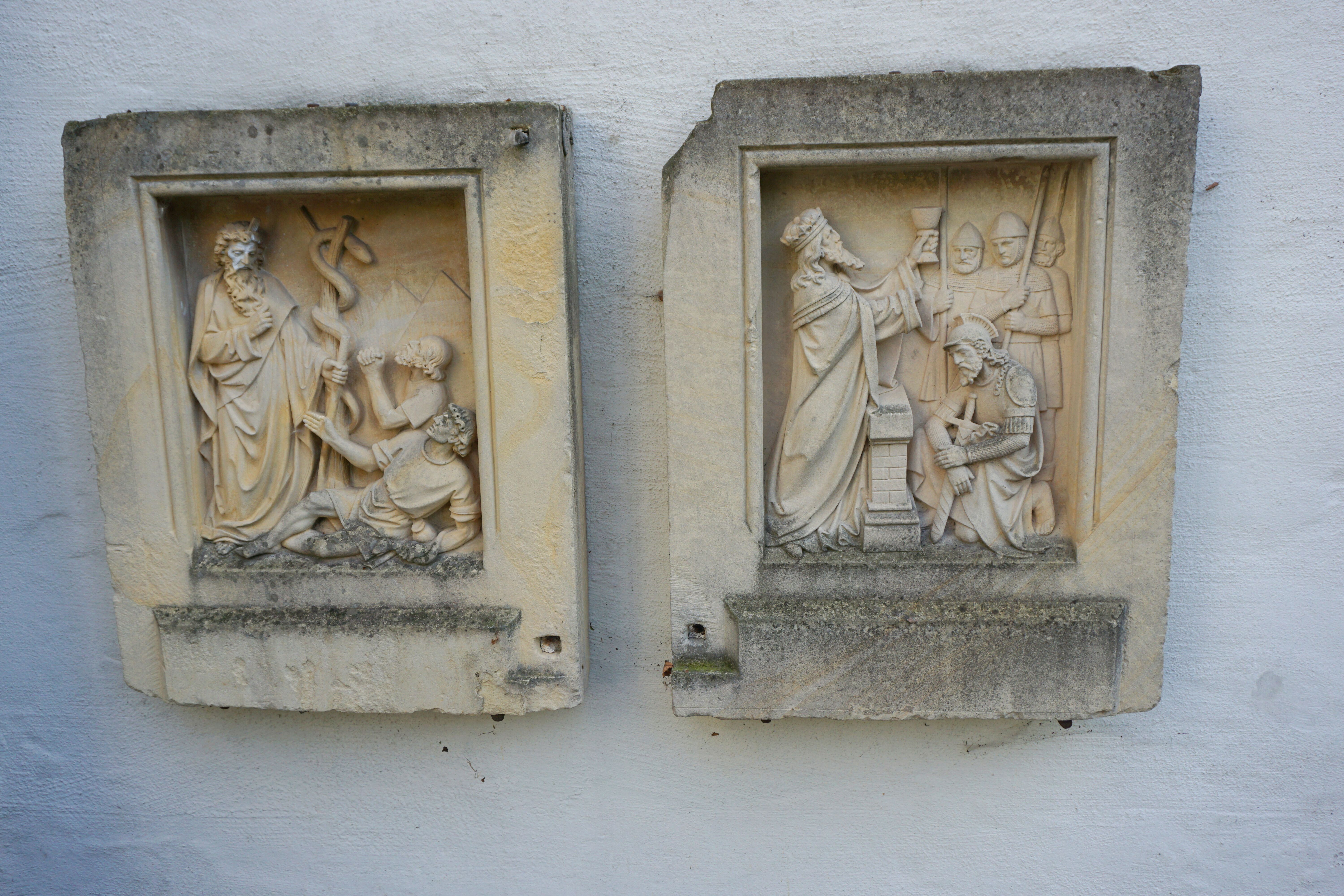 Hier zwei Reliefs aus Sandstein an der Außenmauer der Kreuzkirche.