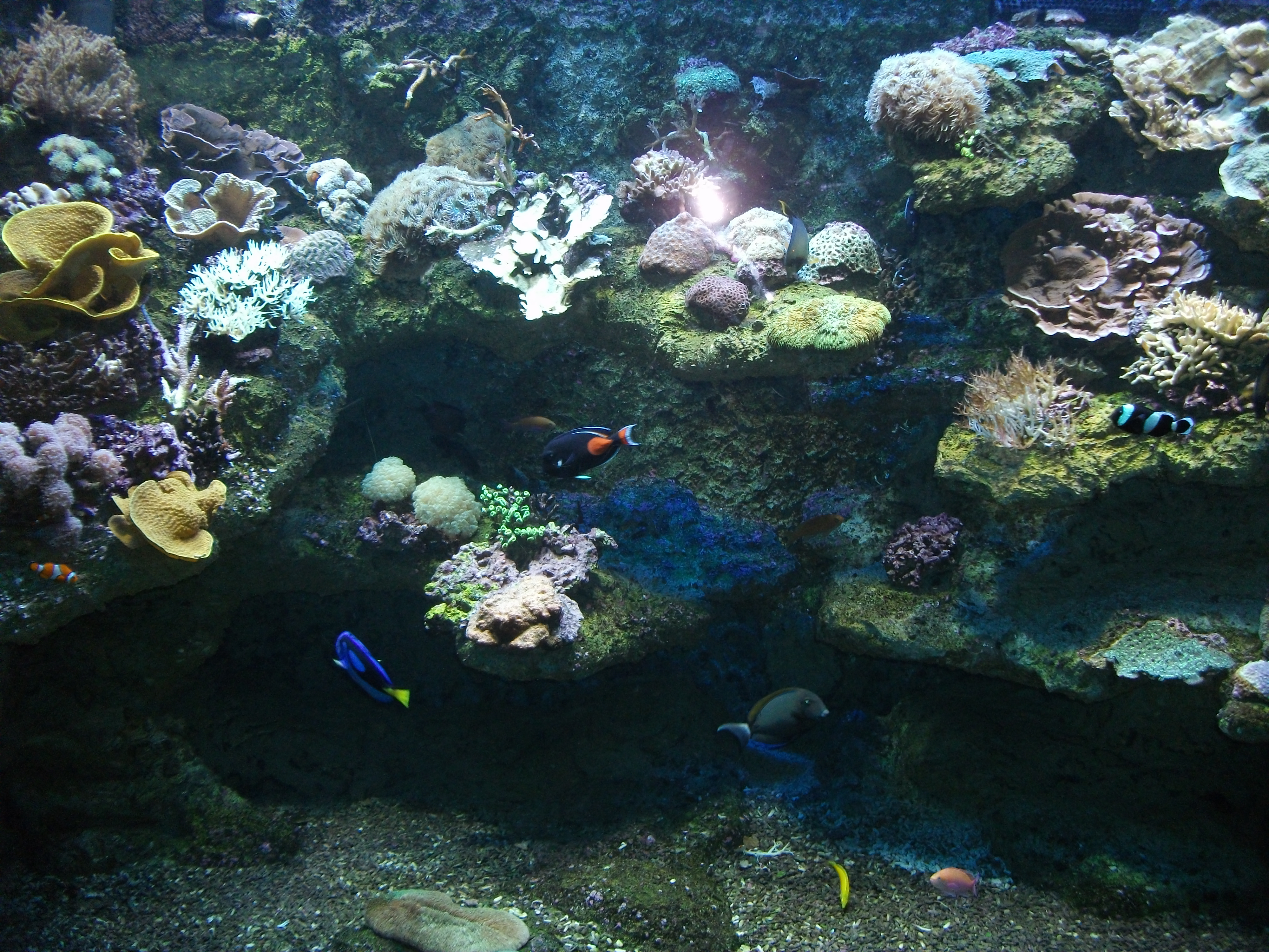 Hier sehen Sie ein Aquarium mit Weich- und Steinkorallen sowie verschiedene tropische Fischarten.