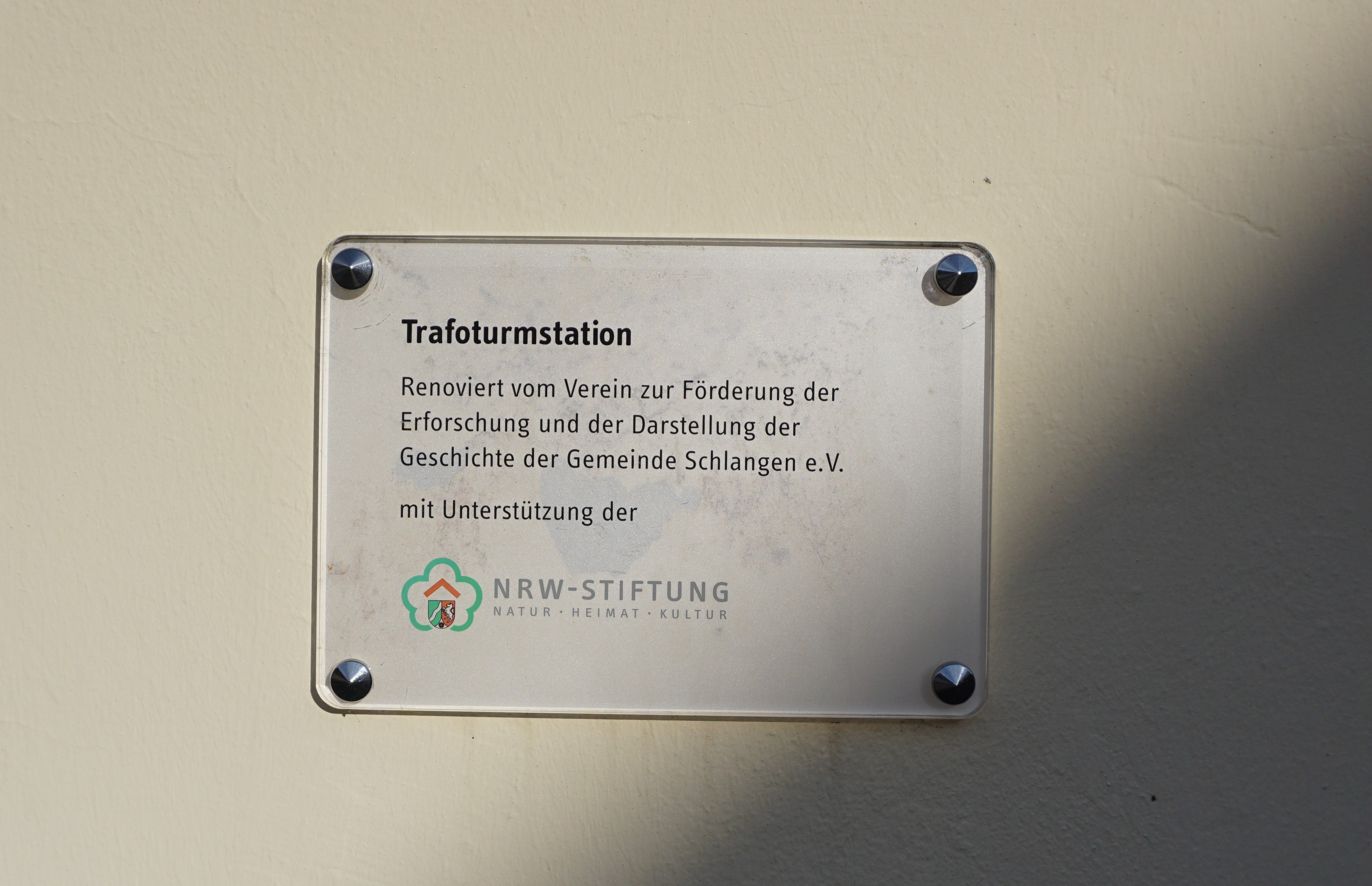 NRW-Stiftung Tafel an der Trafoturmstation, Schlangen.