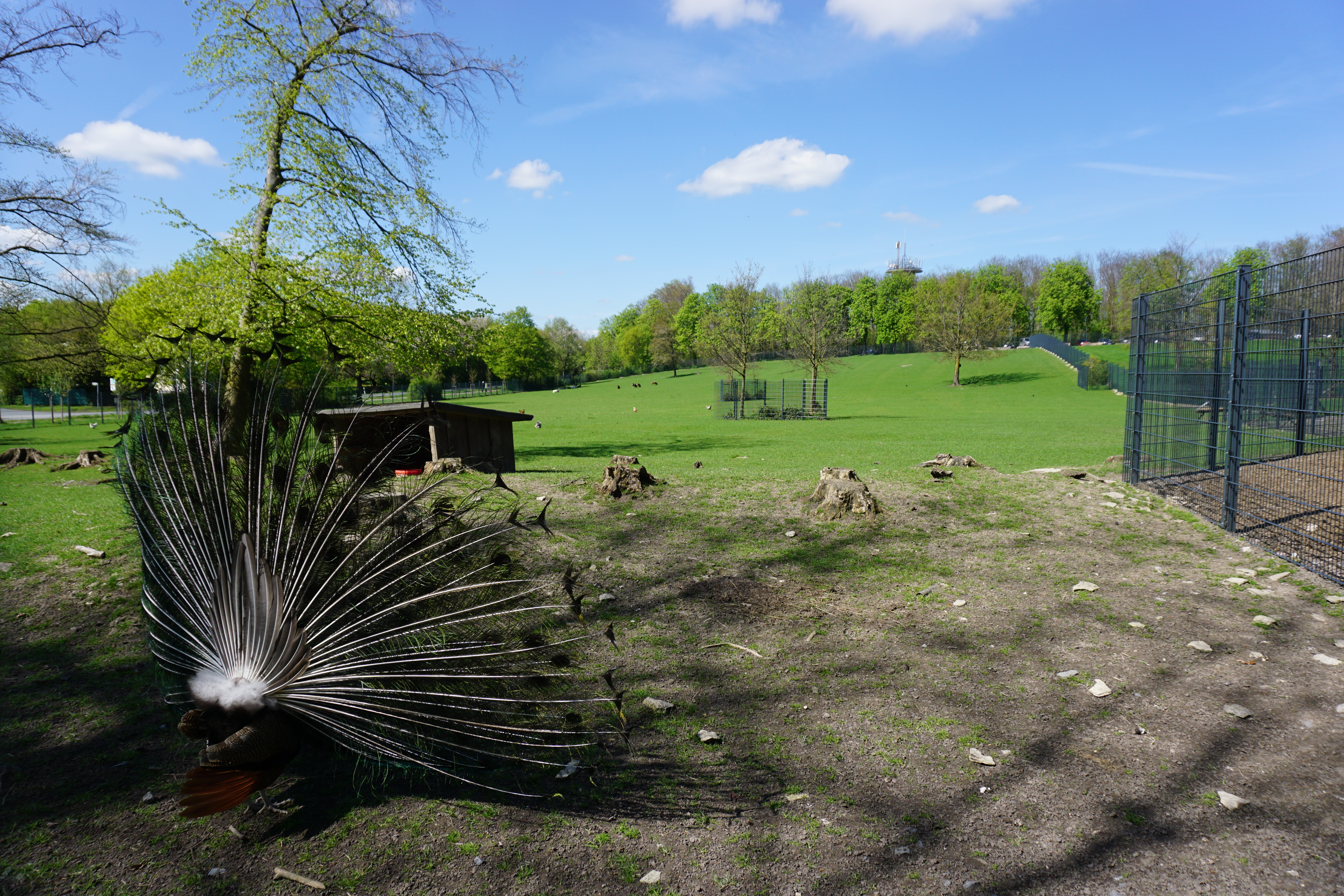 Hier präsentiert der männliche Pfau, während der Balz, seinen prächtigen Federfächer.