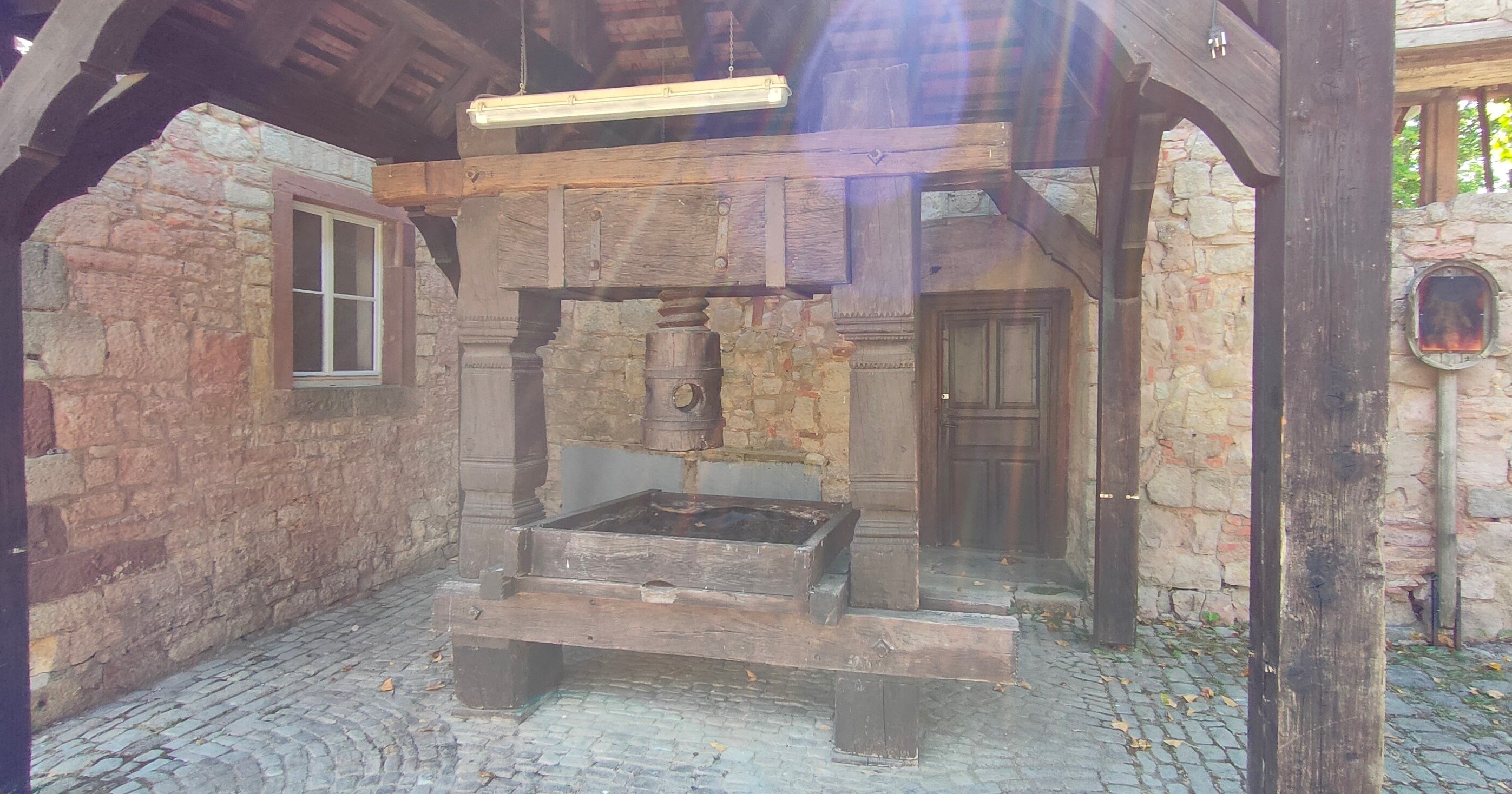 Historische Weinpresse im Innenhof des Schlosses Saaleck, Hammelburg.
